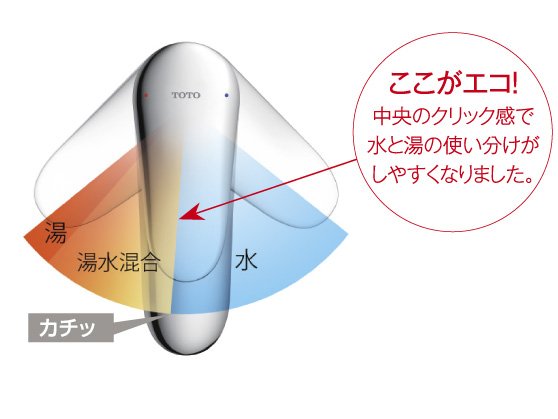 水と湯との境に「カチッ」というクリック感を設けたことで、水と湯の使い分けがしやすくなりました。給湯器のムダな作動を防いで節湯するため、ガスの消費を抑制します。