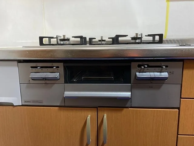施工後⇒N3WV6RWTP2SI、ノーリツ、ファミ、ガラストップ、フラットエッジ、ダブル高火力、無水両面焼、幅60mタイプ、ビルトインコンロ