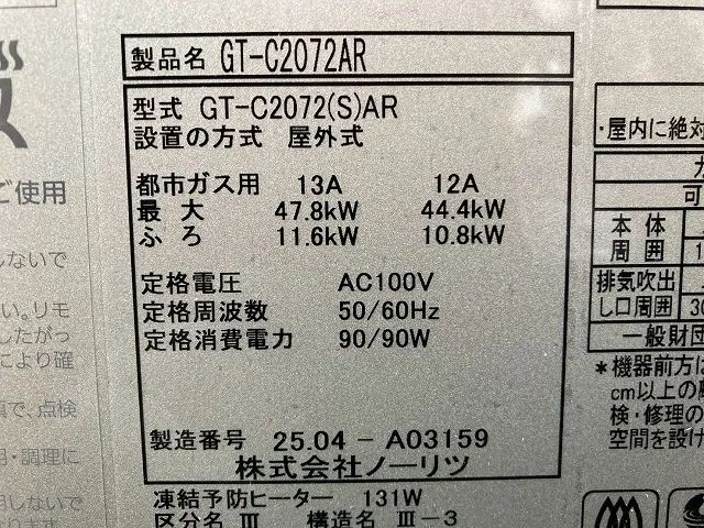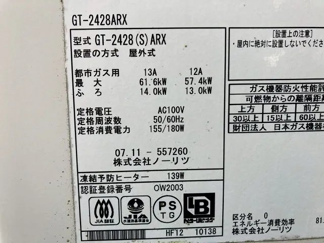 既存の給湯器は、GT-2428ARX、ノーリツ、24号、フルオート、屋外据置型、給湯器です。