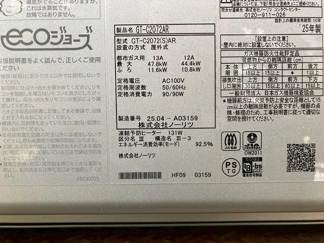 新しい給湯器は、GT-C2072AR BL、ノーリツ、エコジョーズ、20号、フルオート、屋外据置型、給湯器です。