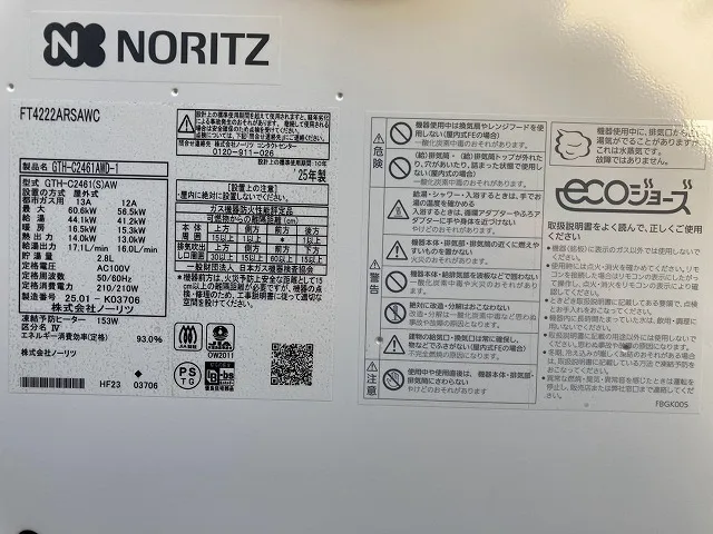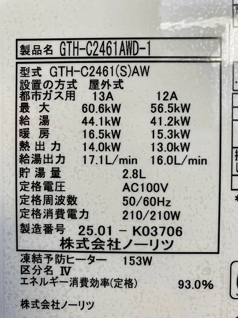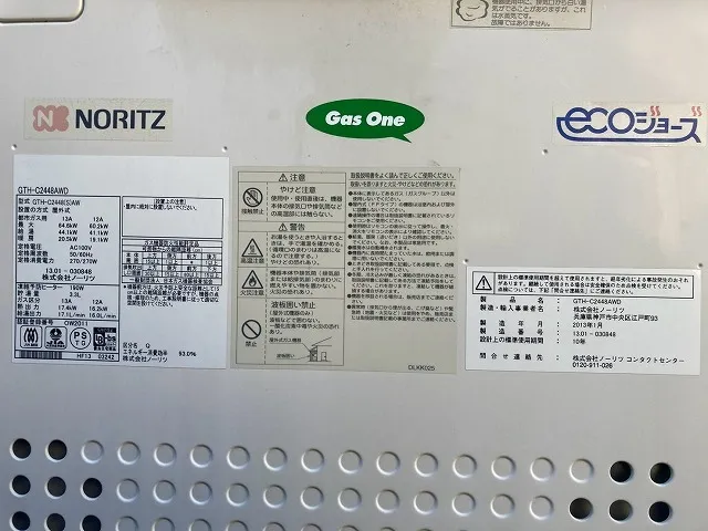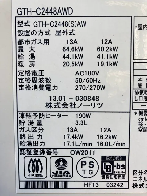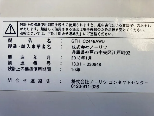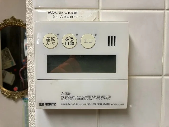既存の給湯器は、GTH-C2448AWD、ノーリツ、24号、フルオート、屋外壁掛型、配管カバー付き、ガス温水暖房付ふろ給湯器です。