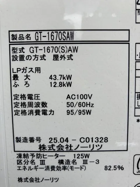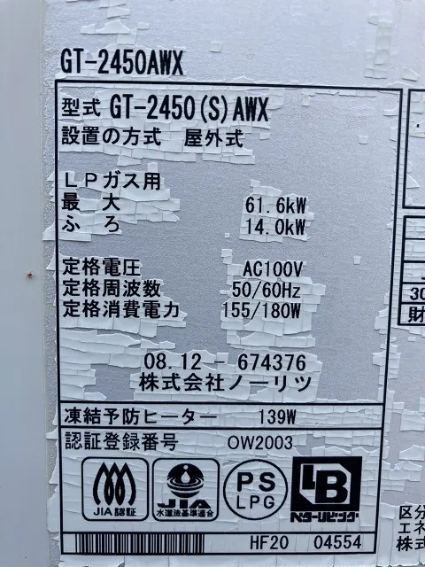 既存の給湯器は、GT-2450SAWX、ノーリツ、24号、フルオート、屋外壁掛型、給湯器です。