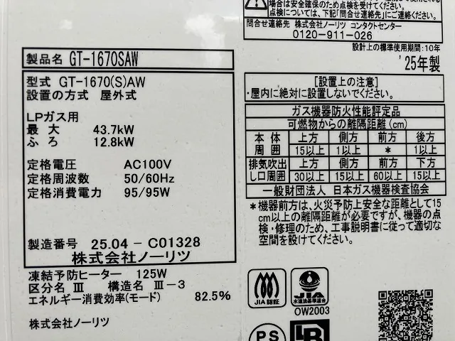 本日は、埼玉県上尾市向山で(1戸建て)、GT-1670SAW BL、ノーリツ、16号、オート、屋外壁掛型、給湯器交換工事をしました。
