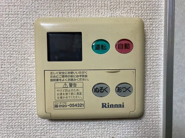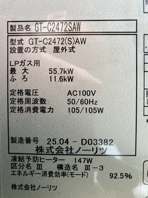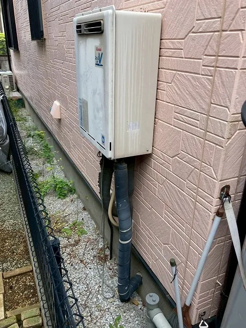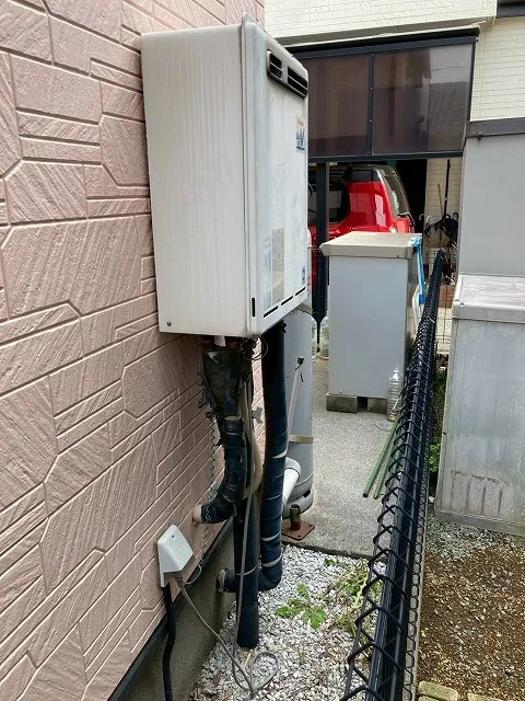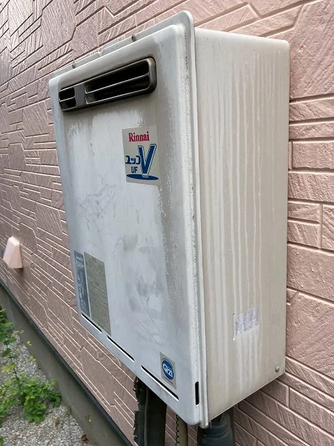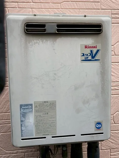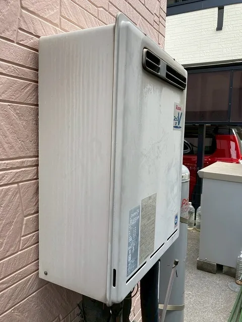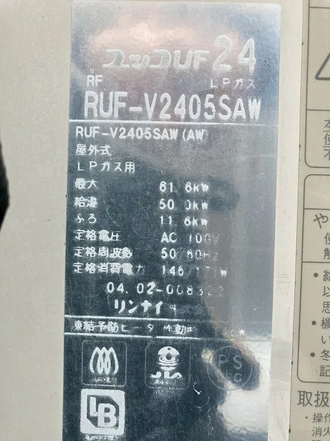 既存の給湯器は、RUF-V2405SAW、リンナイ、24号、オート、ユッコUF24、屋外壁掛型、給湯器です。