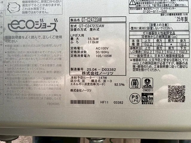 リンナイ、RUF-V2405SAW→GT-C2472SAW BL、ノーリツ、エコジョーズ、24号、オート、屋外壁掛型、給湯器交換工事ー埼玉県さいたま市岩槻区城南