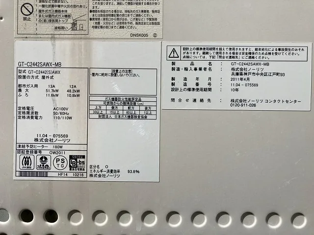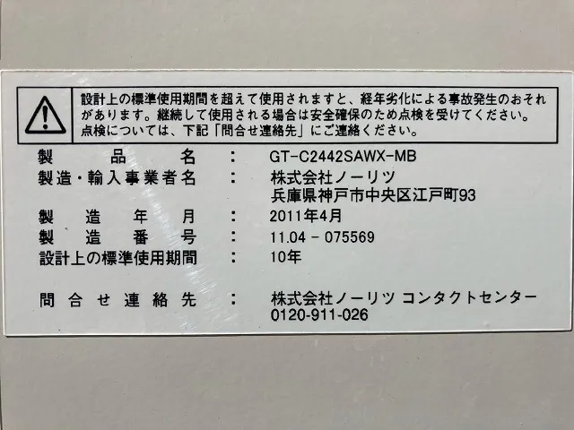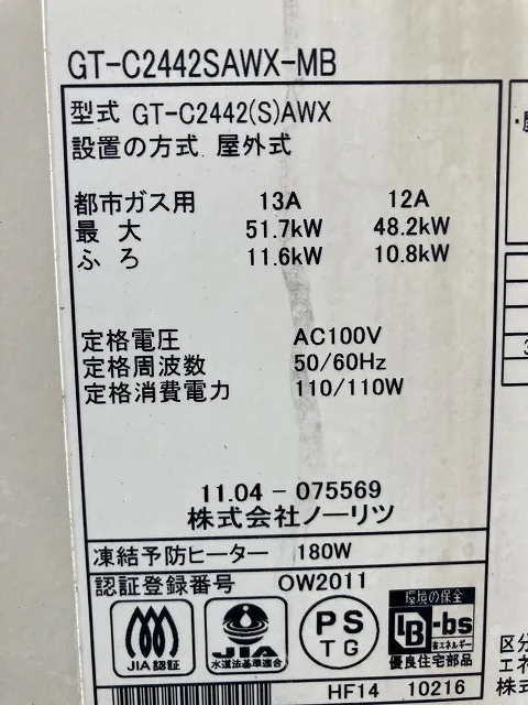 既存の給湯器は、GT-C2442SAWX-MB、ノーリツ、エコジョーズ、24号、オート、屋外壁掛型、給湯器です。