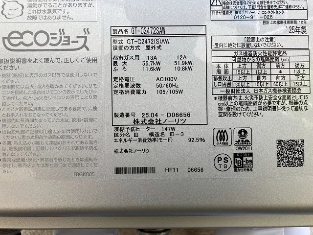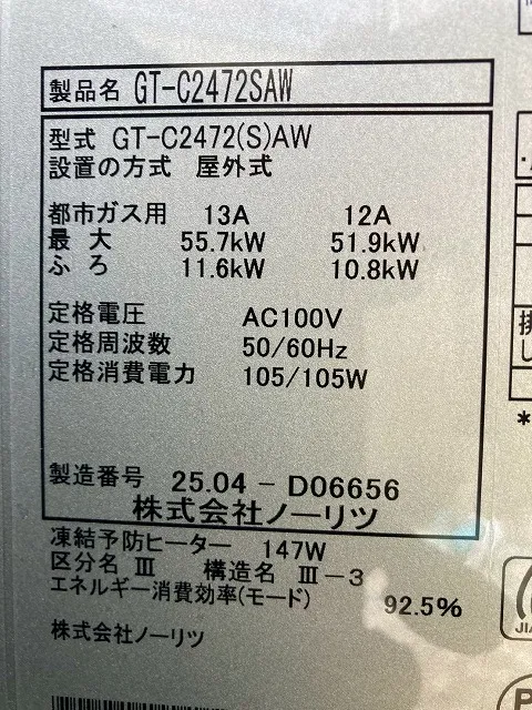 新しい給湯器は、GT-C2472SAW BL、ノーリツ、エコジョーズ、24号、オート、屋外壁掛型、給湯器です。