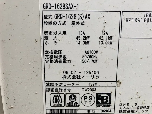 既存の給湯器は、GRQ-1628SAX-1、ノーリツ、16号、オート、浴槽隣接設置、屋外据置型、給湯器です。