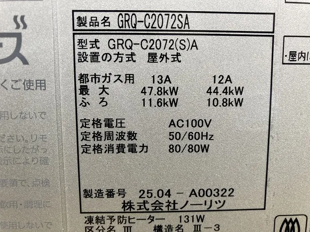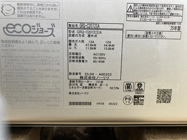 新しい給湯器は、GRQ-C2072SA BL、ノーリツ、エコジョーズ、20号、オート、浴槽隣接設置、屋外据置型、給湯器です。