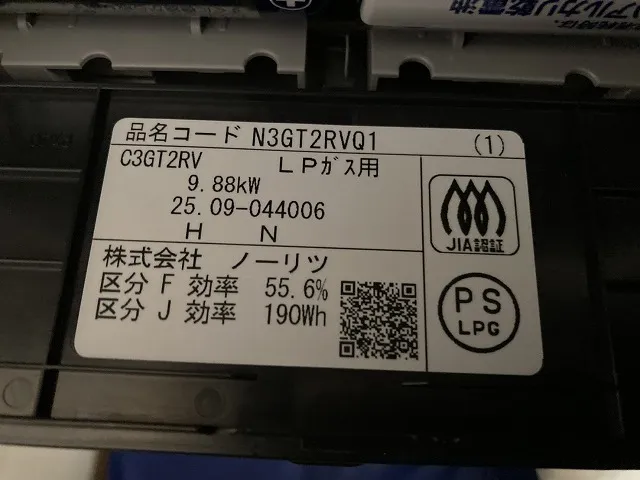 新しいビルトインコンロは、N3GT2RVQ1、ノーリツ、メタルトップ、3口、ダブル高火力、無水片面焼グリル、天板幅60cmタイプ、ビルトインコンロです。