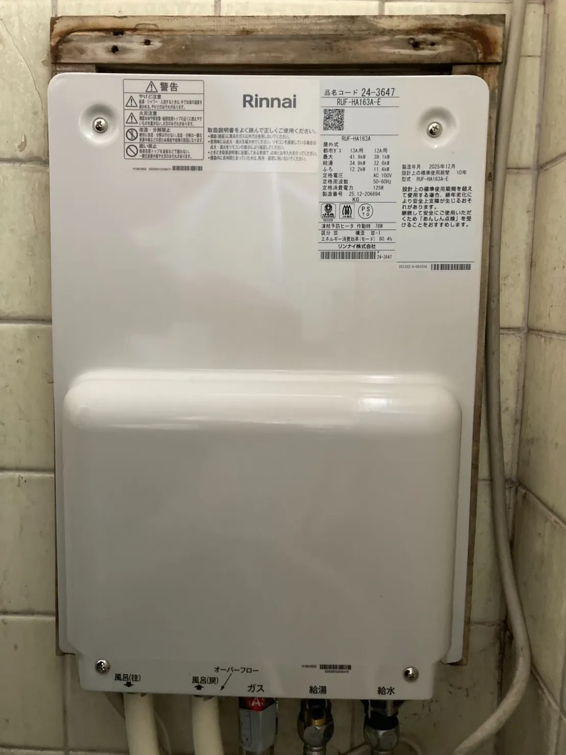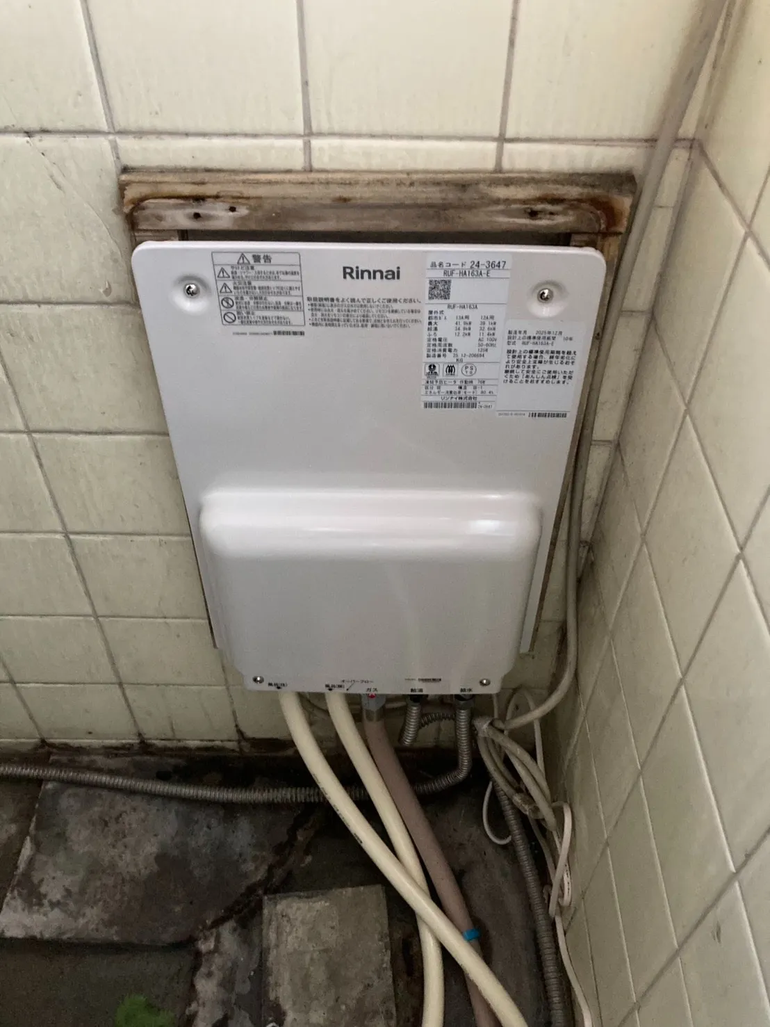 施工後→リンナイ、RUF-HA163A-E、16号、フルオート、壁貫通型、給湯器