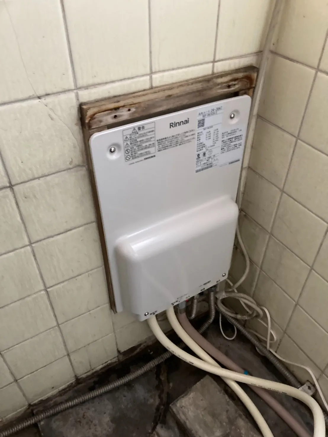本日は、埼玉県春日部市大枝で(団地)、リンナイ、RUF-HA163A-E、16号、フルオート、壁貫通型、給湯器交換工事をしました。