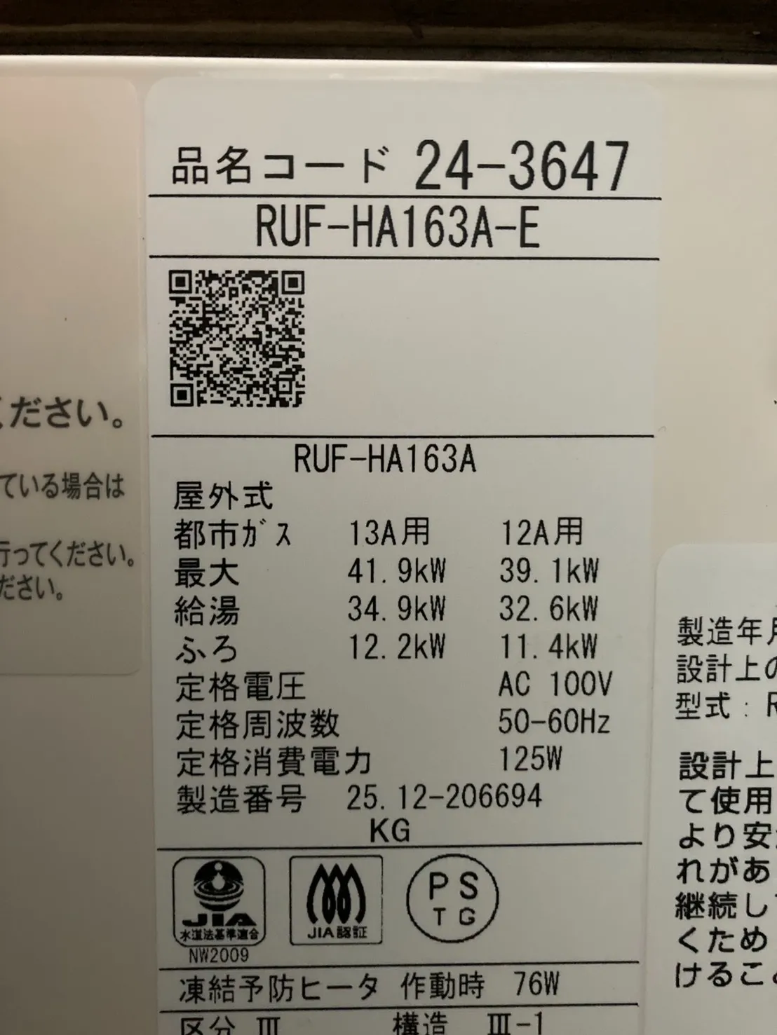 新しい給湯器は、リンナイ、RUF-HA163A-E、16号、フルオート、壁貫通型、給湯器です。
