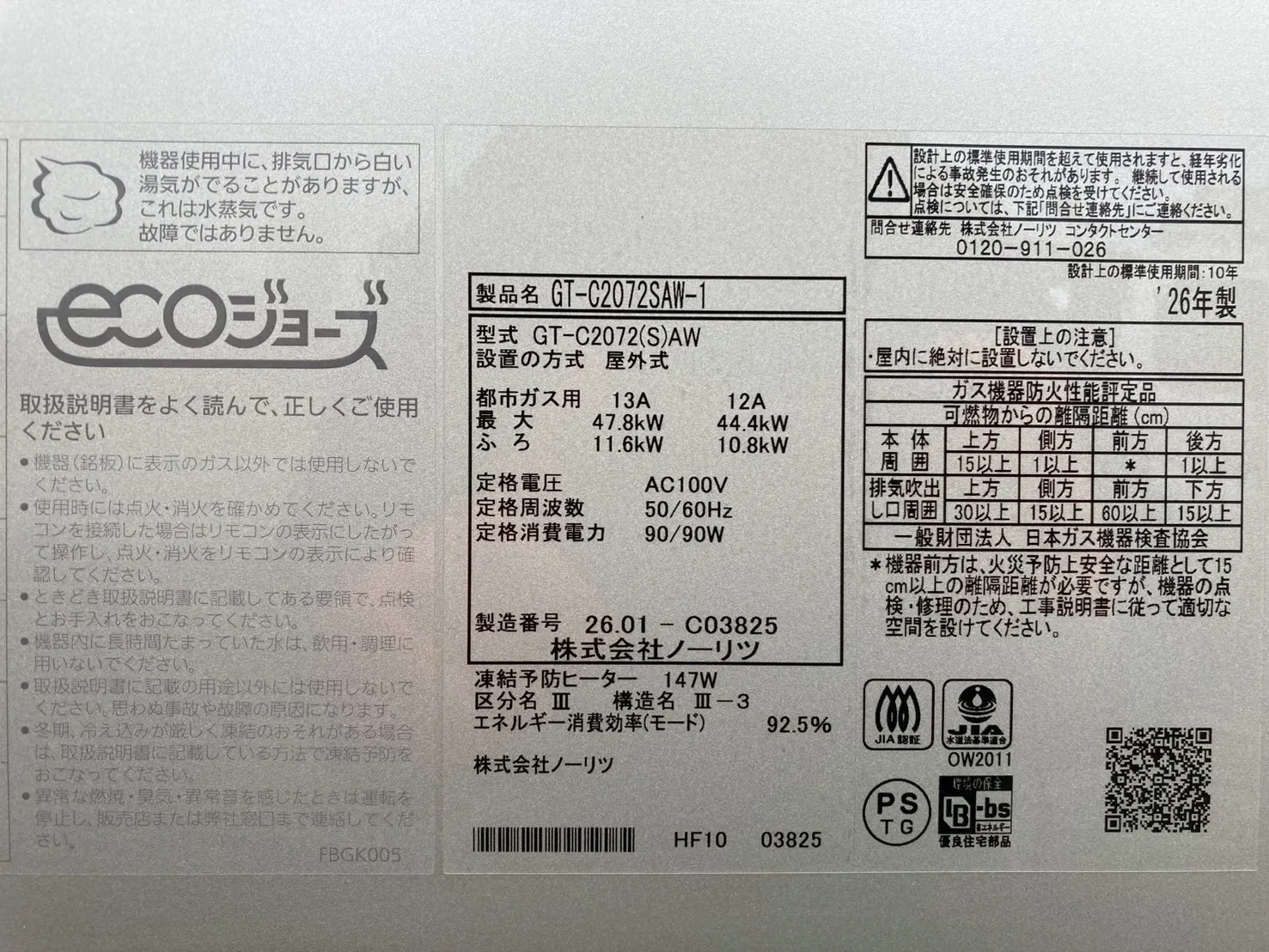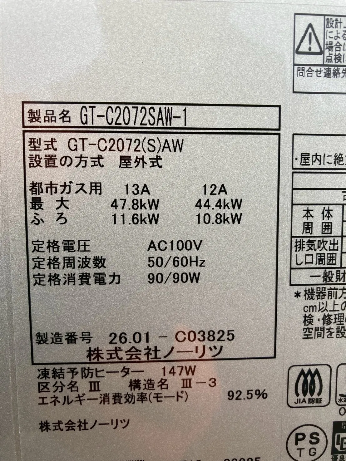 新しい給湯器は、ノーリツ、GT-C2072SAW-1 BL、20号、エコジョーズ、オート、屋外壁掛型、給湯器です。