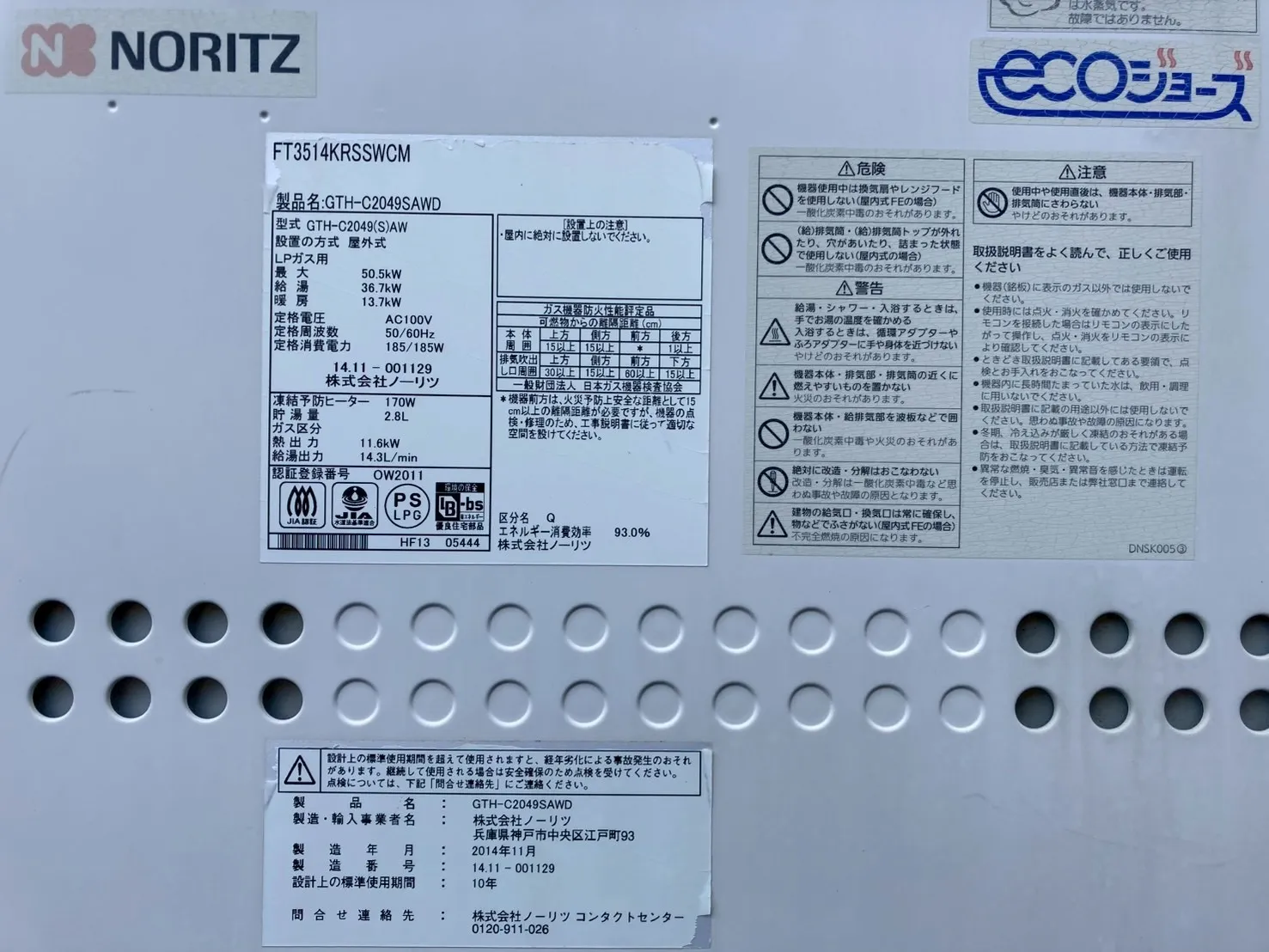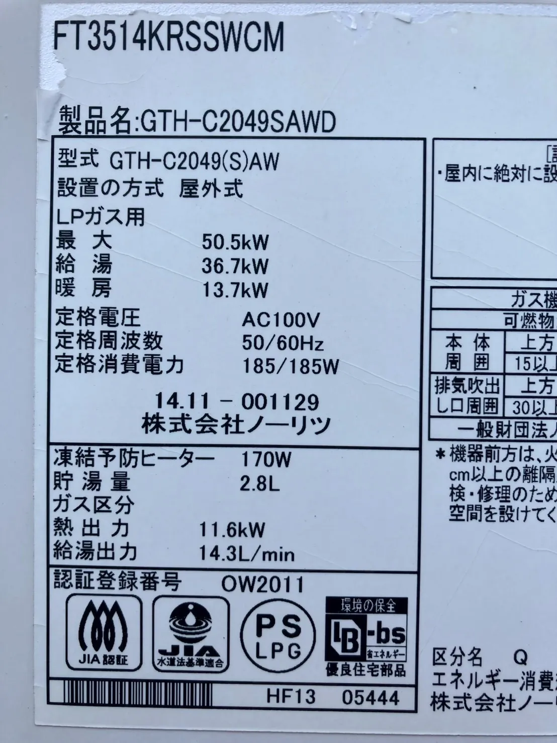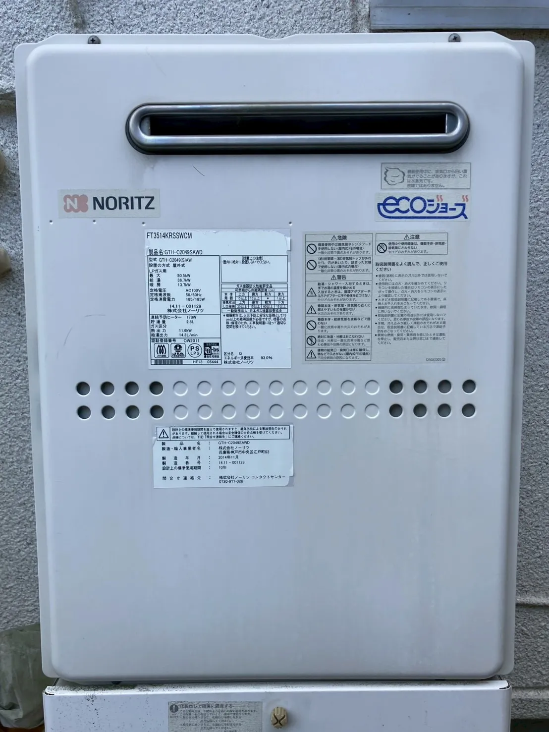 既存の給湯器は、ノーリツ、GTH-C2049SAWD BL、20号、エコジョーズ、オート、据置台付き、ガス温水暖房付ふろ給湯器です。