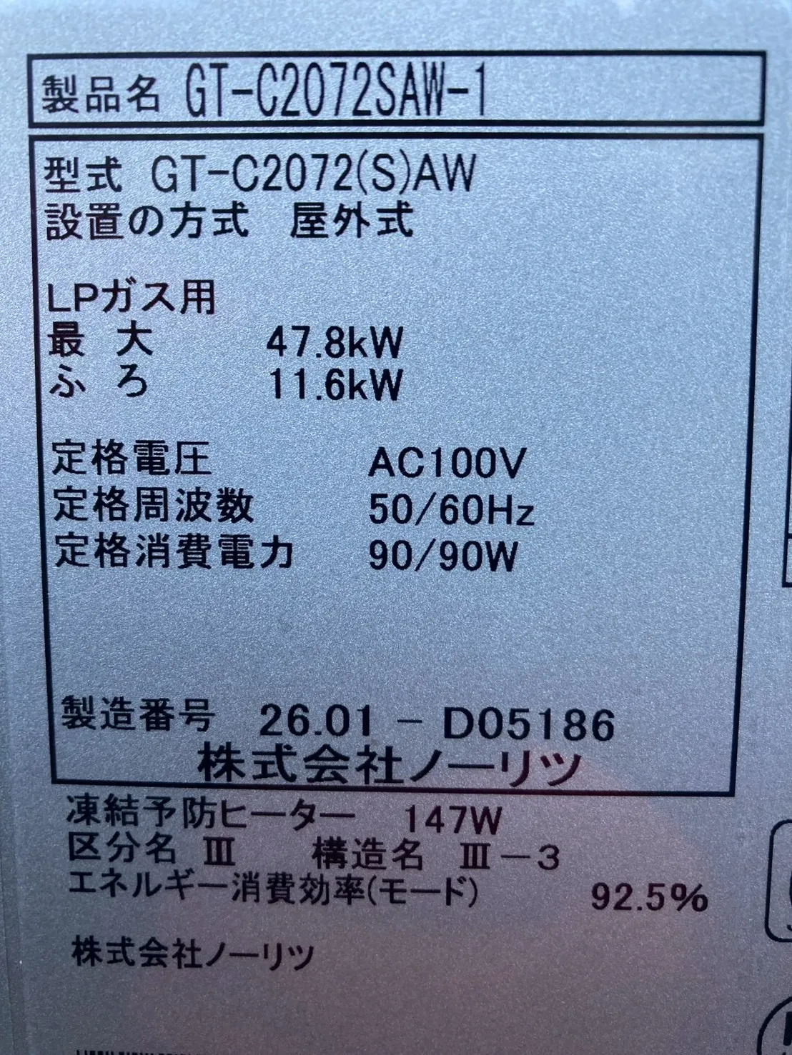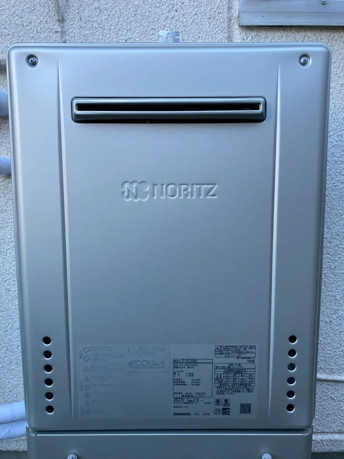新しい給湯器は、ノーリツ、GT-C2072SAW-1 BL、20号、エコジョーズ、オート、据置台付き、給湯器です。