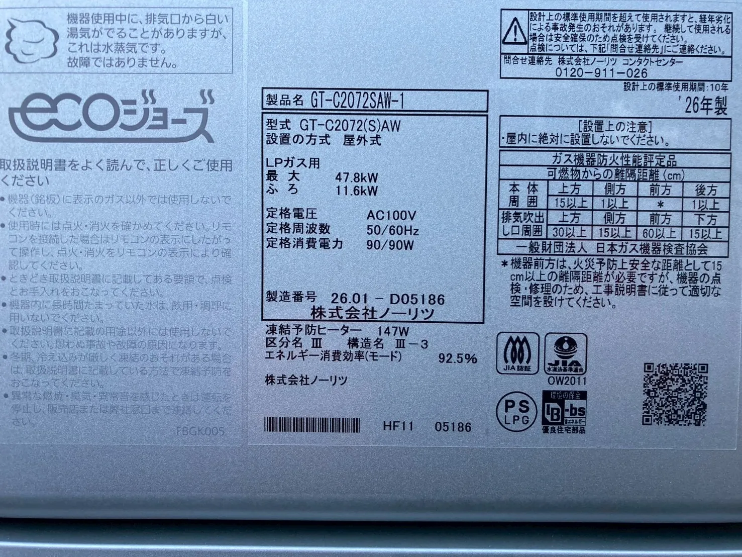 本日は、埼玉県蓮田市綾瀬で(1戸建て)、ノーリツ、GT-C2072SAW-1 BL、20号、エコジョーズ、オート、据置台付き、給湯器交換工事をしました。