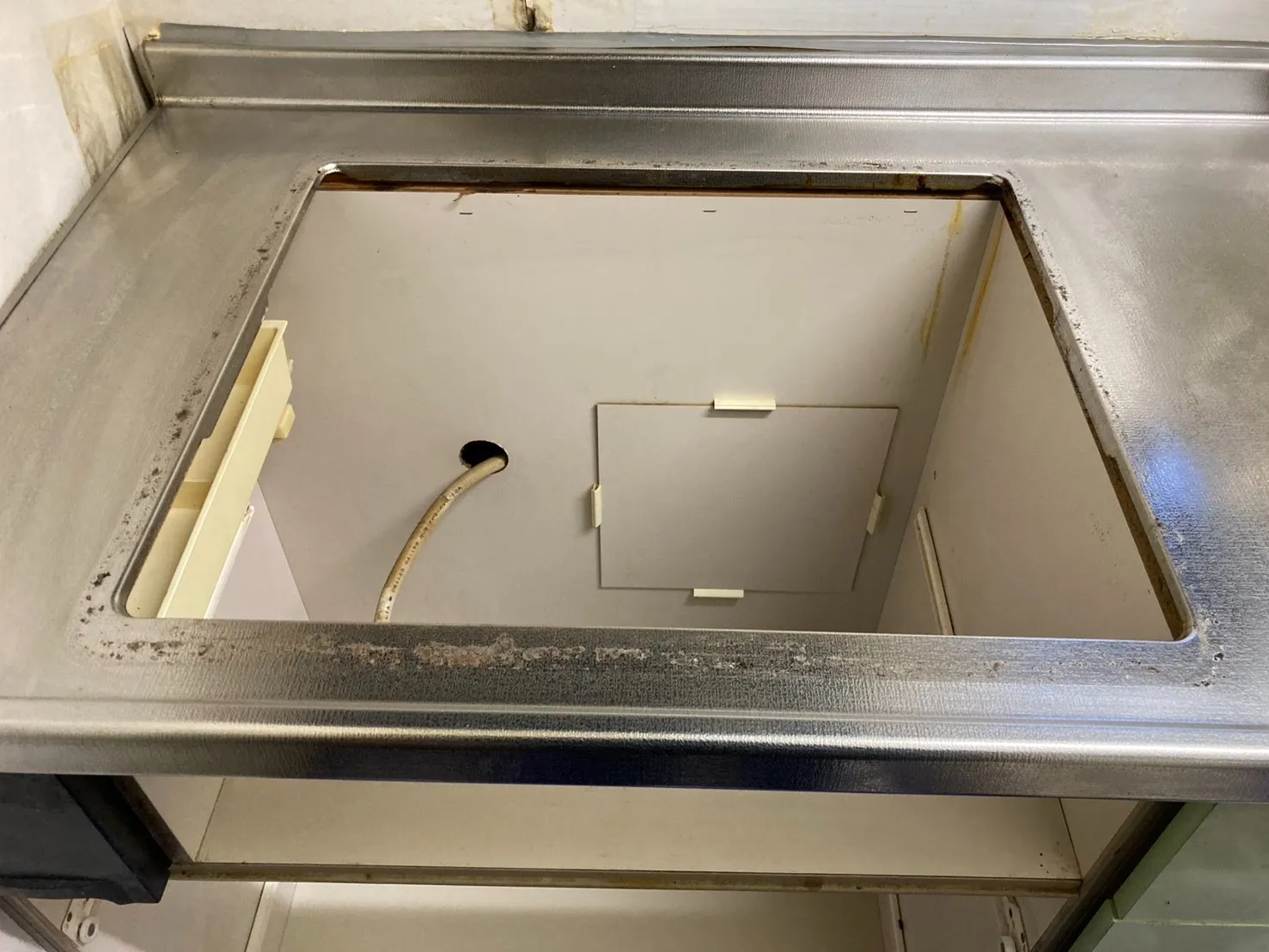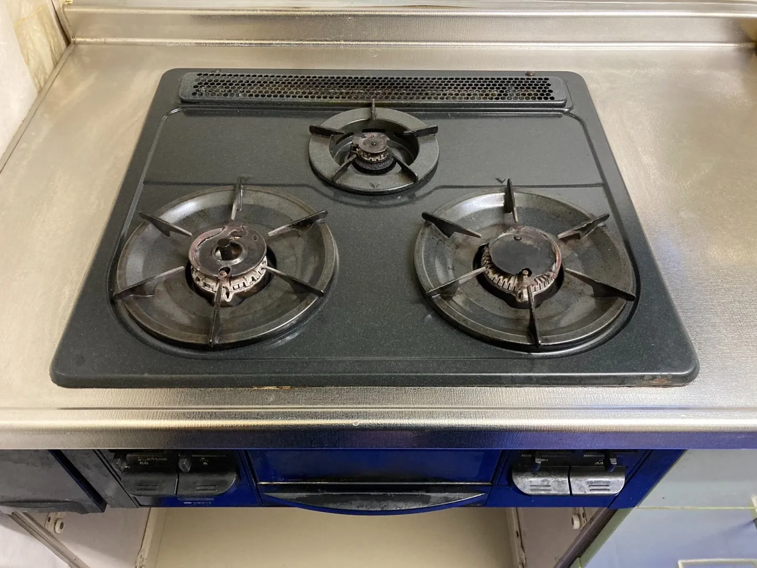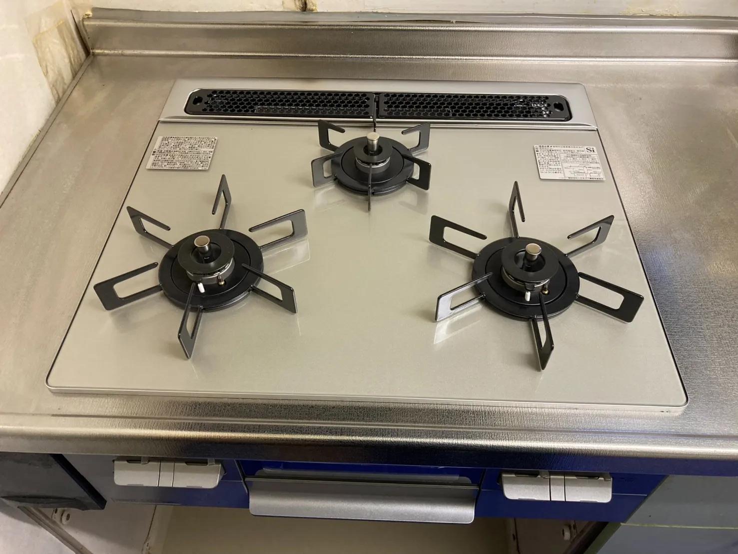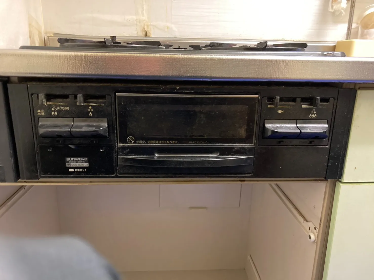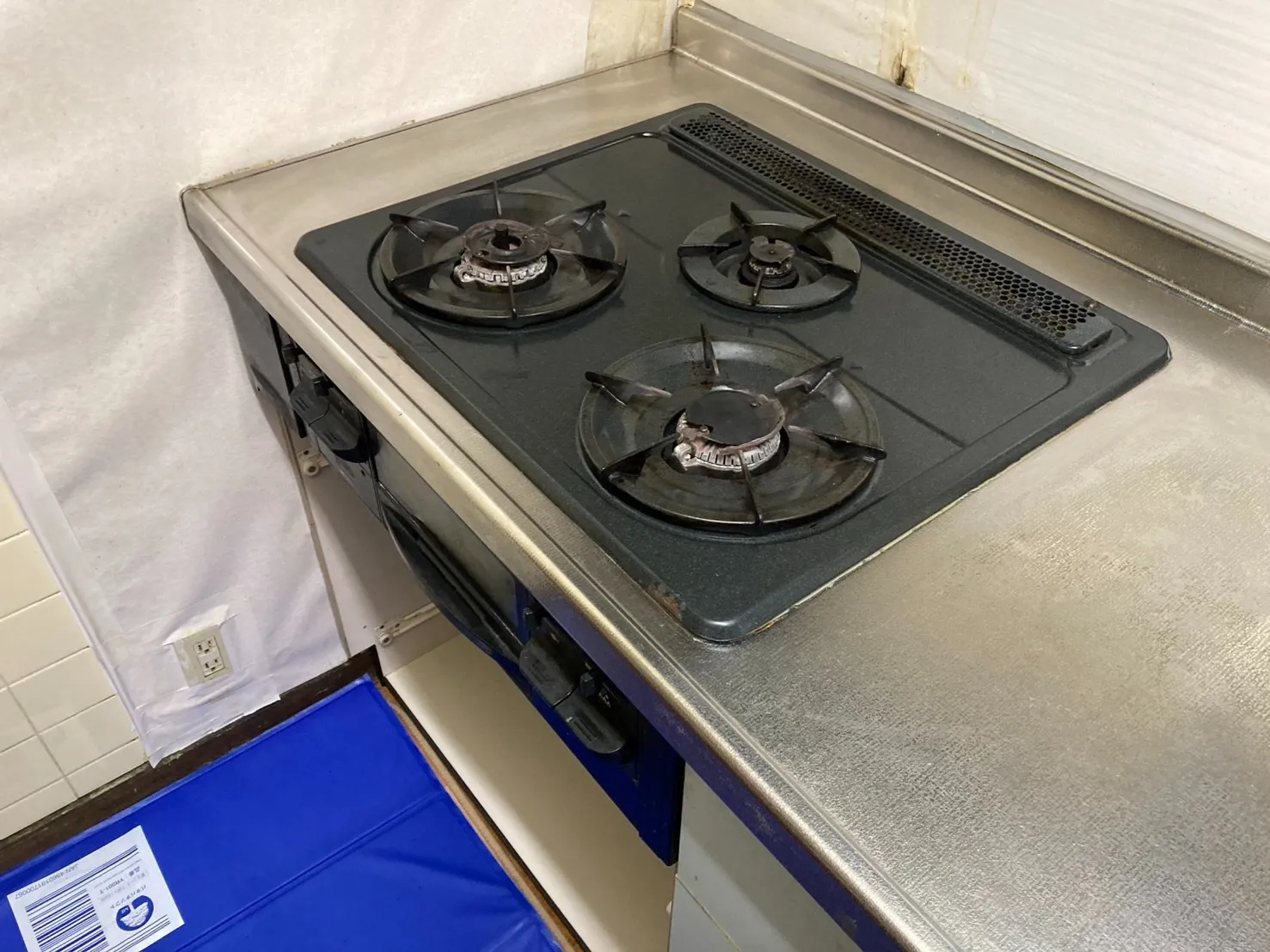 施工前→サンウェーブ、DG32E4NR(HSG631BORHK)、メタルトップ、天板幅60cmタイプ、3口、ビルトインコンロ