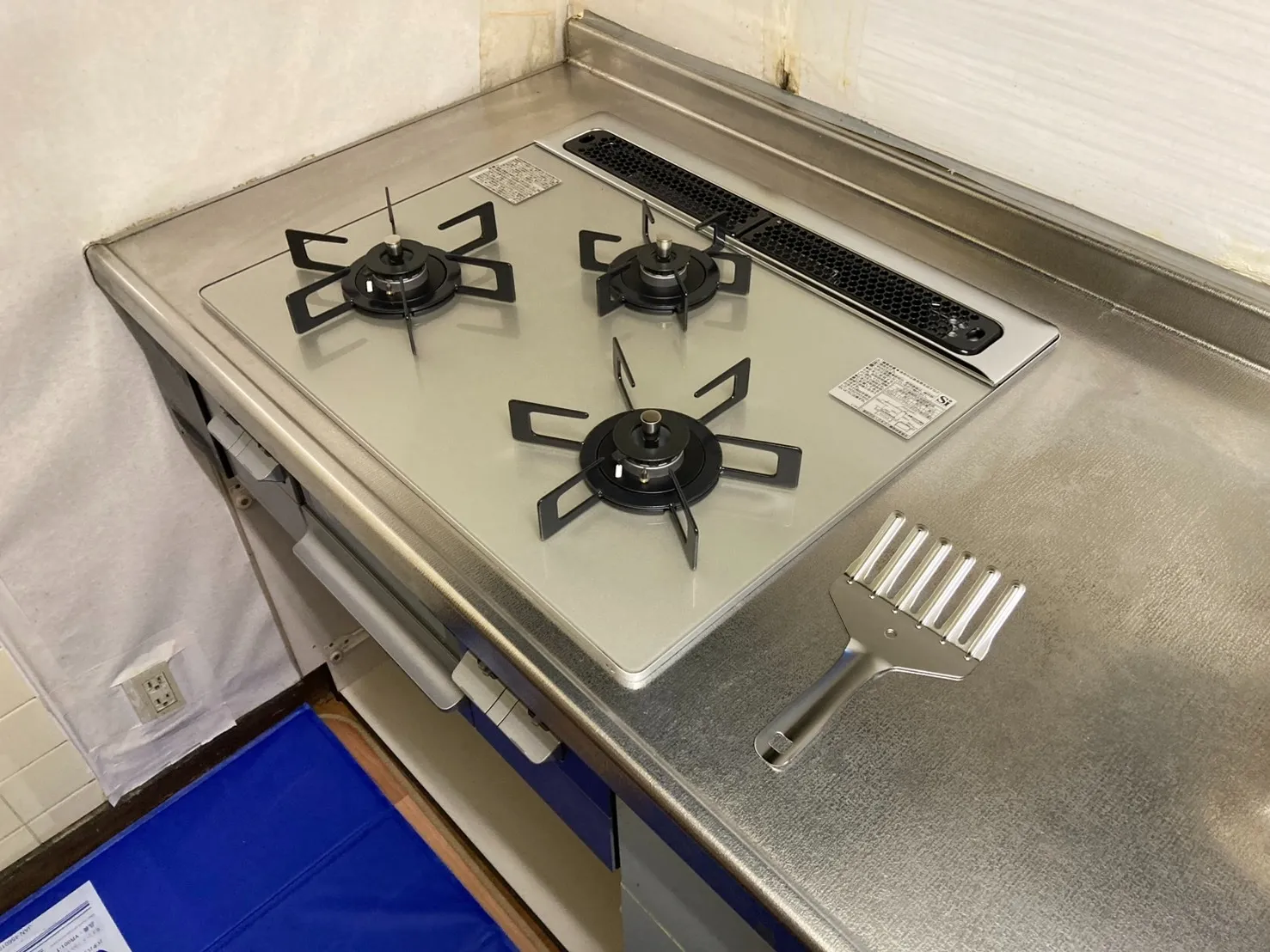 本日は、埼玉県北足立郡伊奈町栄で(1戸建て)、ノーリツ、N3WV6RWTP2SI、ファミ、つやめきガラストップ、天板色ムーンシルバー、フラットエッジ、無水両面焼きグリル、天板幅60mタイプ、3口、ビルトインコンロ交換工事をしました。