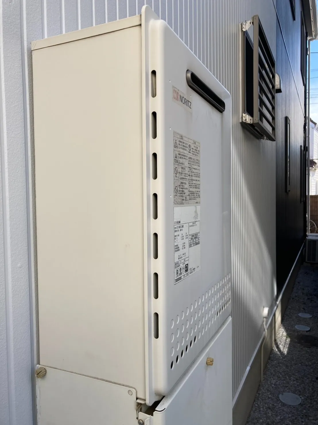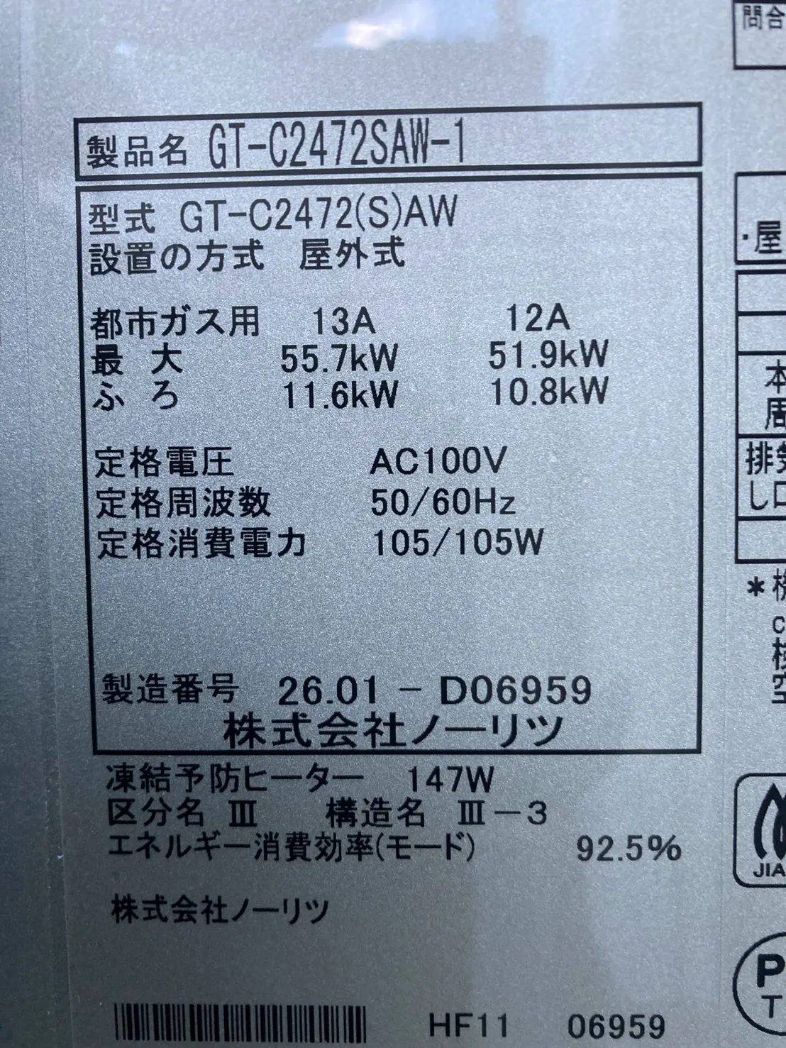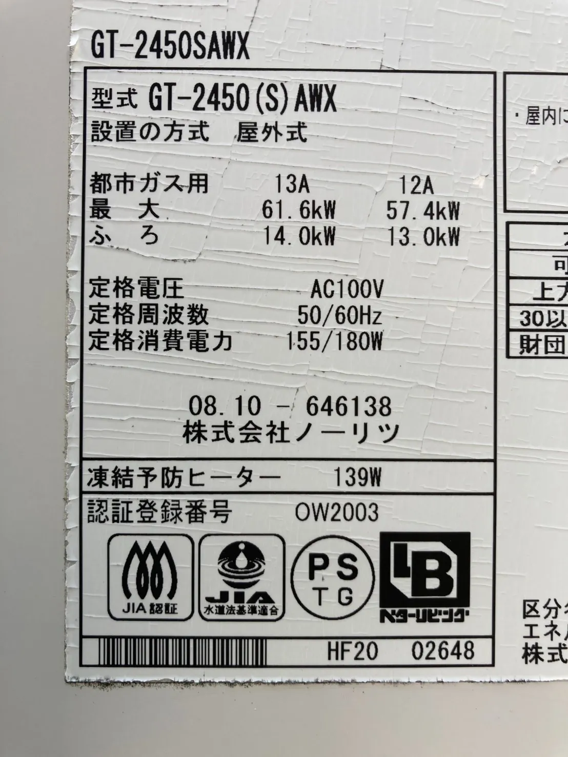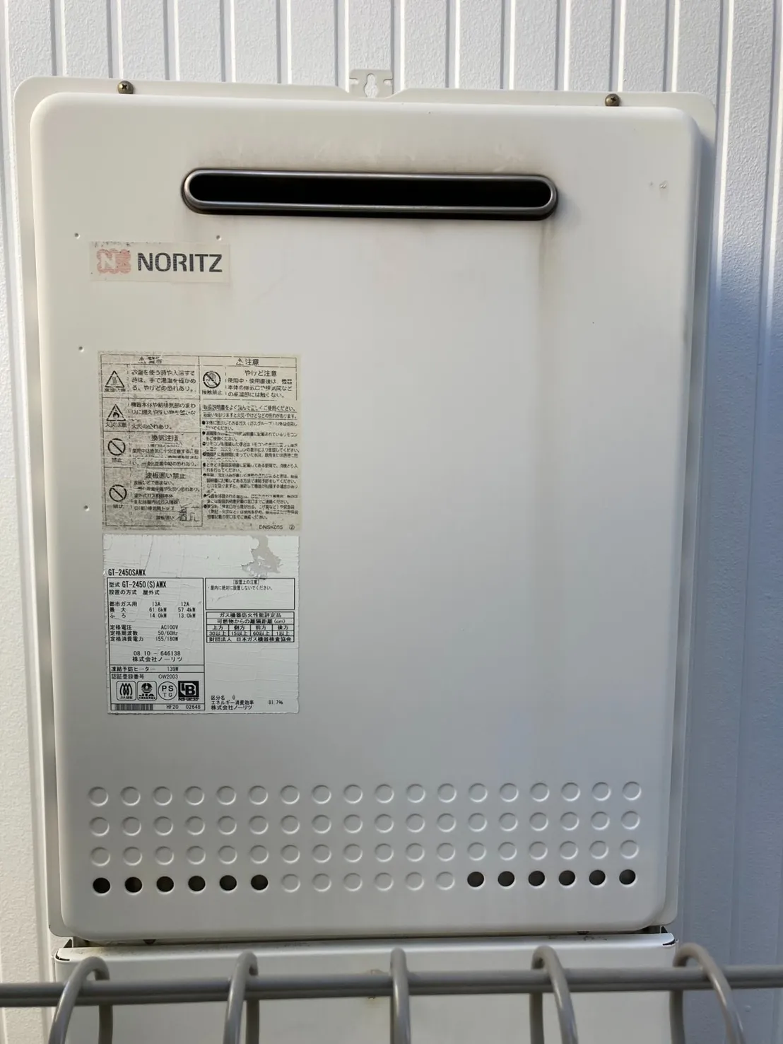 既存の給湯器は、ノーリツ、GT-2450SAWX、24号、オート、屋外壁掛型、配管カバー付き、給湯器です。