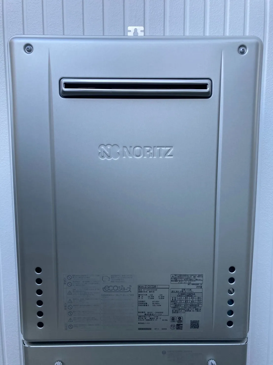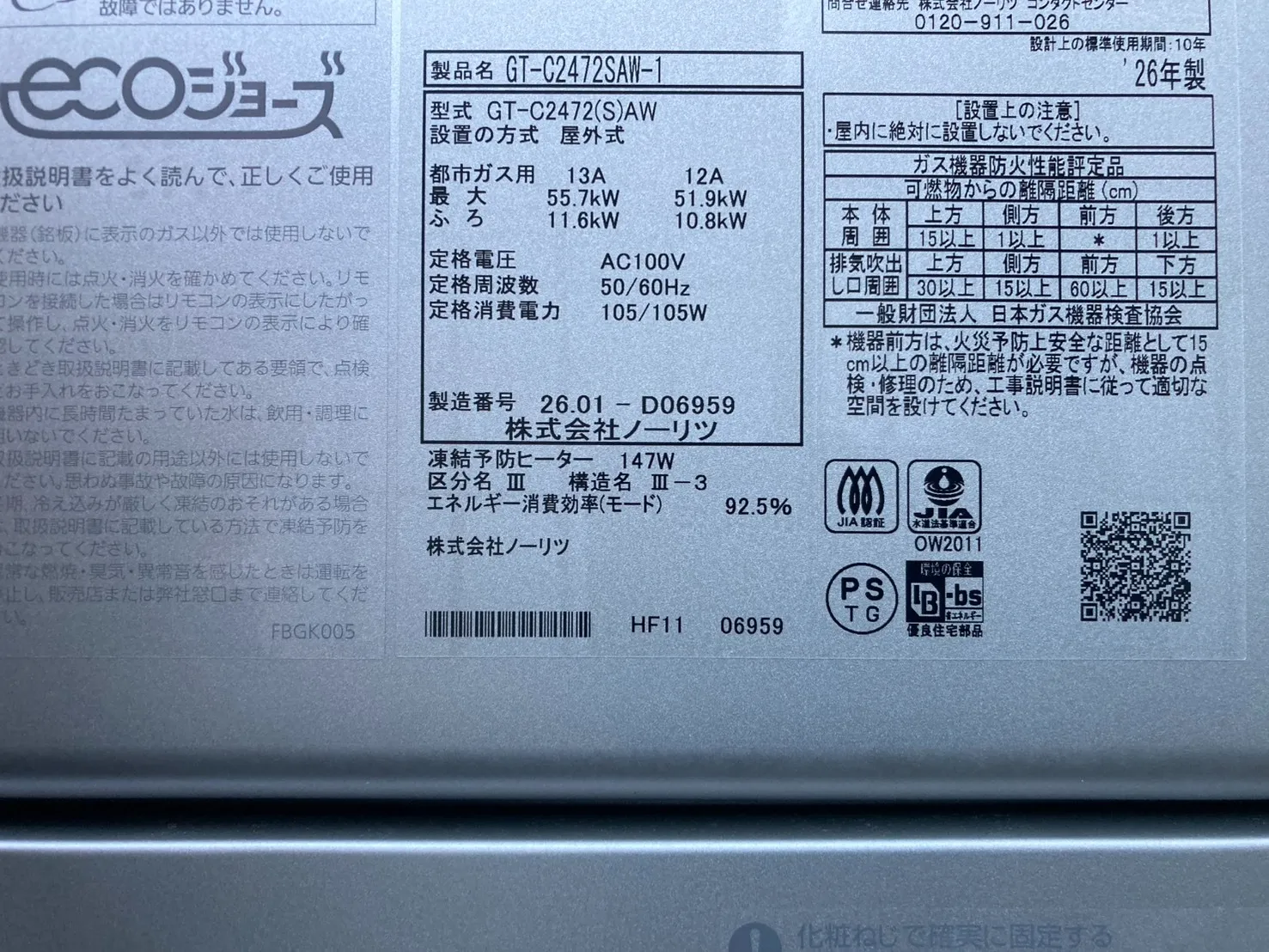 新しい給湯器は、ノーリツ、GT-C2472SAW-1 BL、24号、エコジョーズ、オート、屋外壁掛型、配管カバー付き、給湯器です。