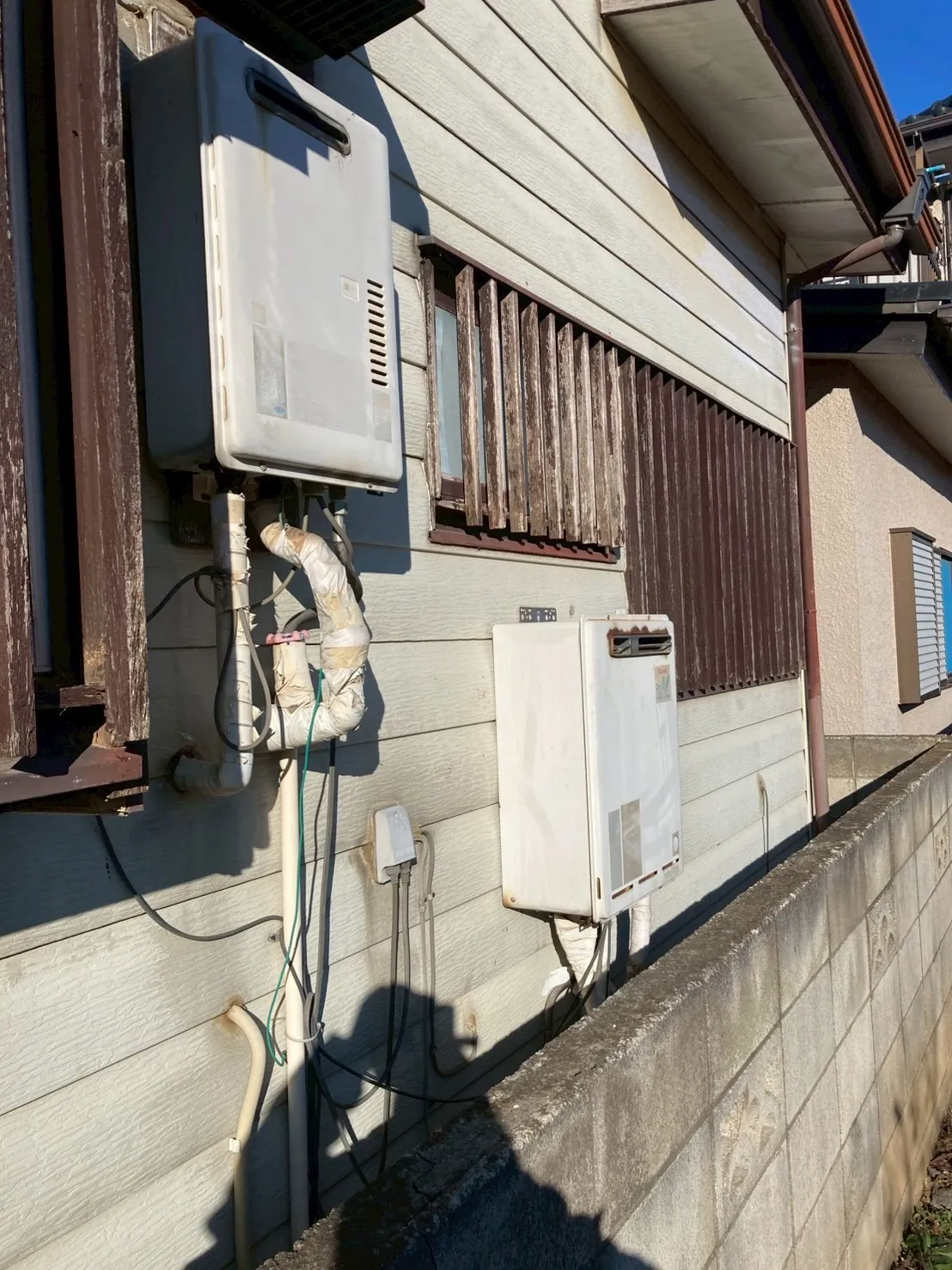 既存の給湯器は2台。リンナイ、RUF-V1615SAW、16号、オート、屋外壁掛型、給湯器。