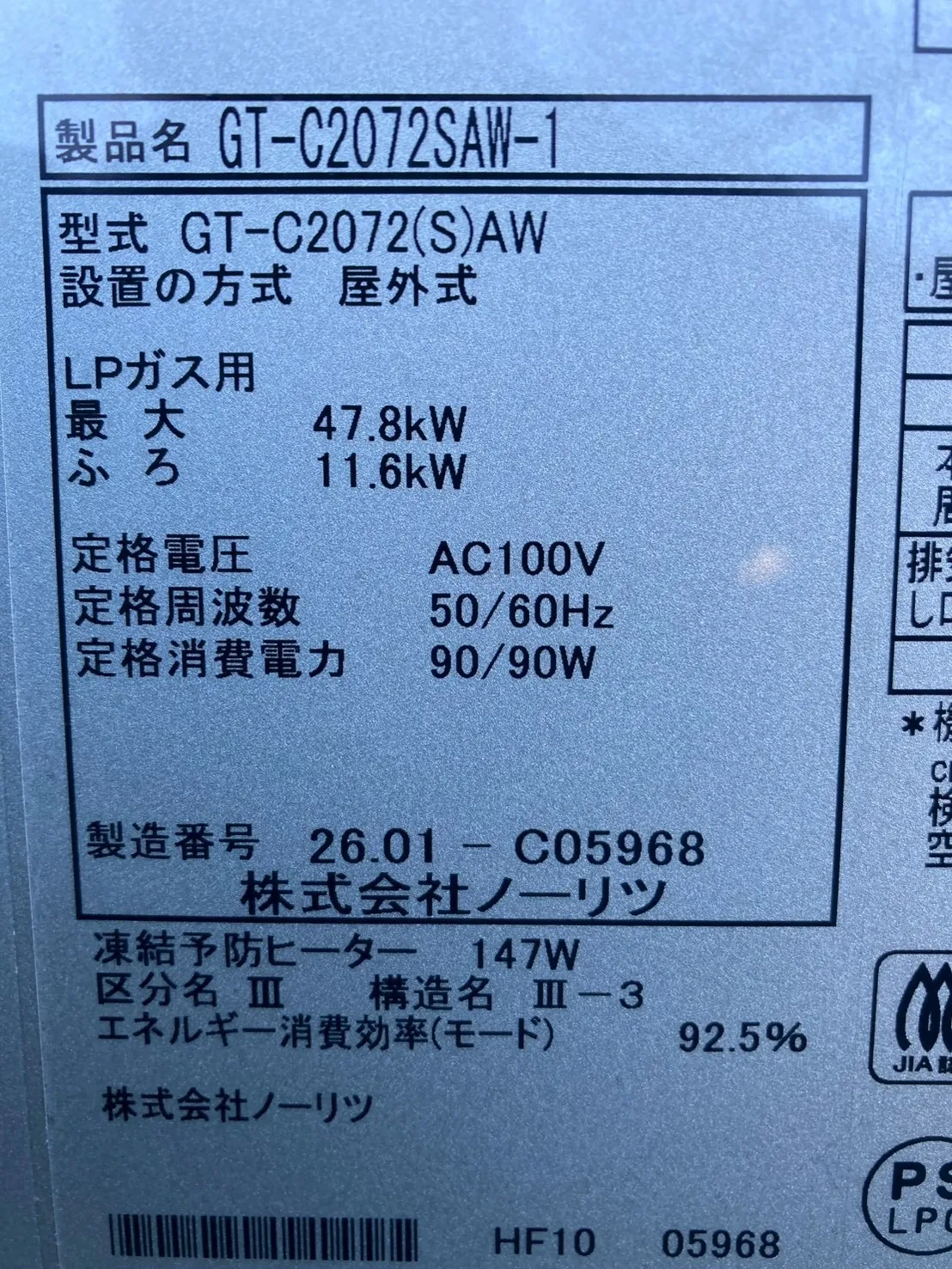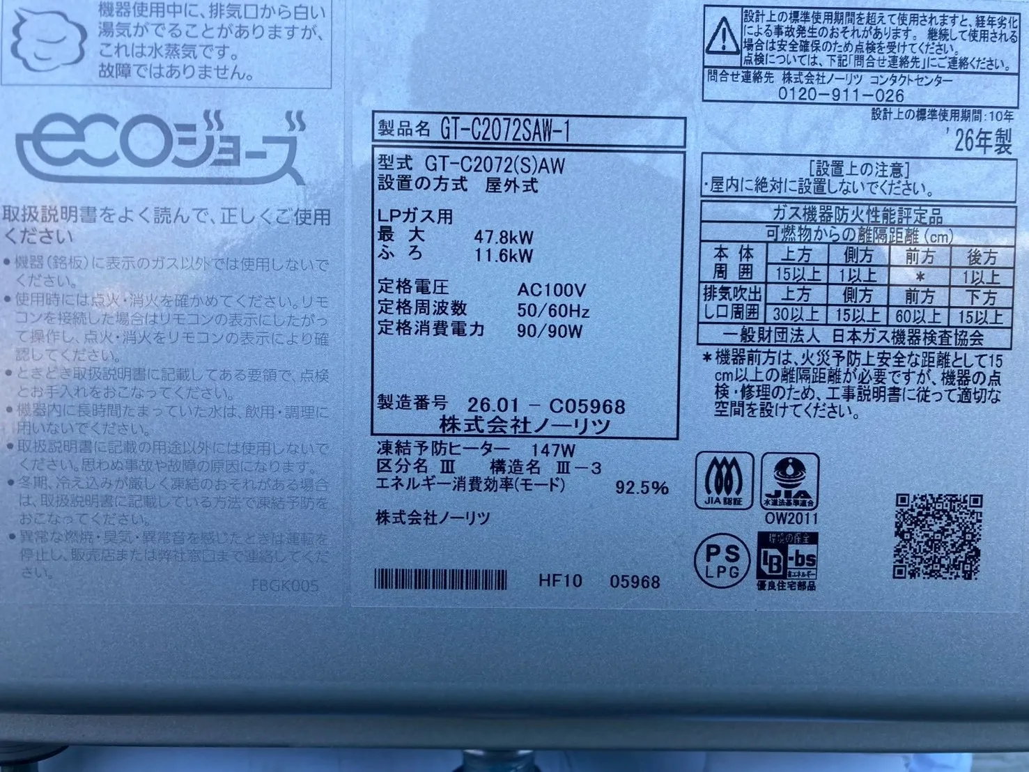 新しい給湯器は1台。ノーリツ、GT-C2072SAW-1 BL、20号、エコジョーズ、オート、屋外壁掛型、給湯器です。