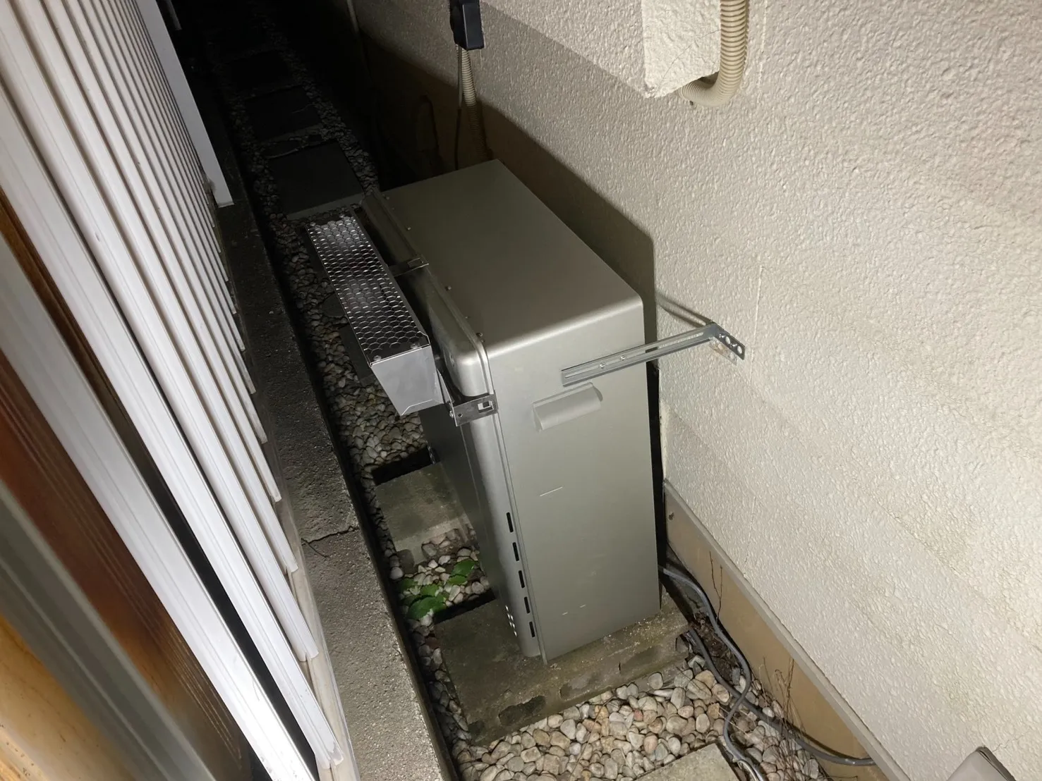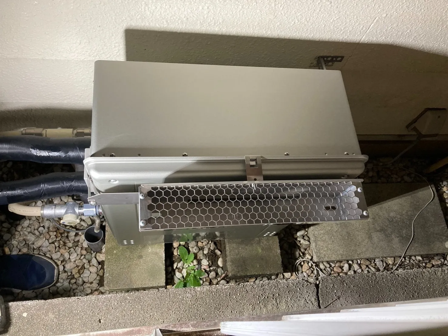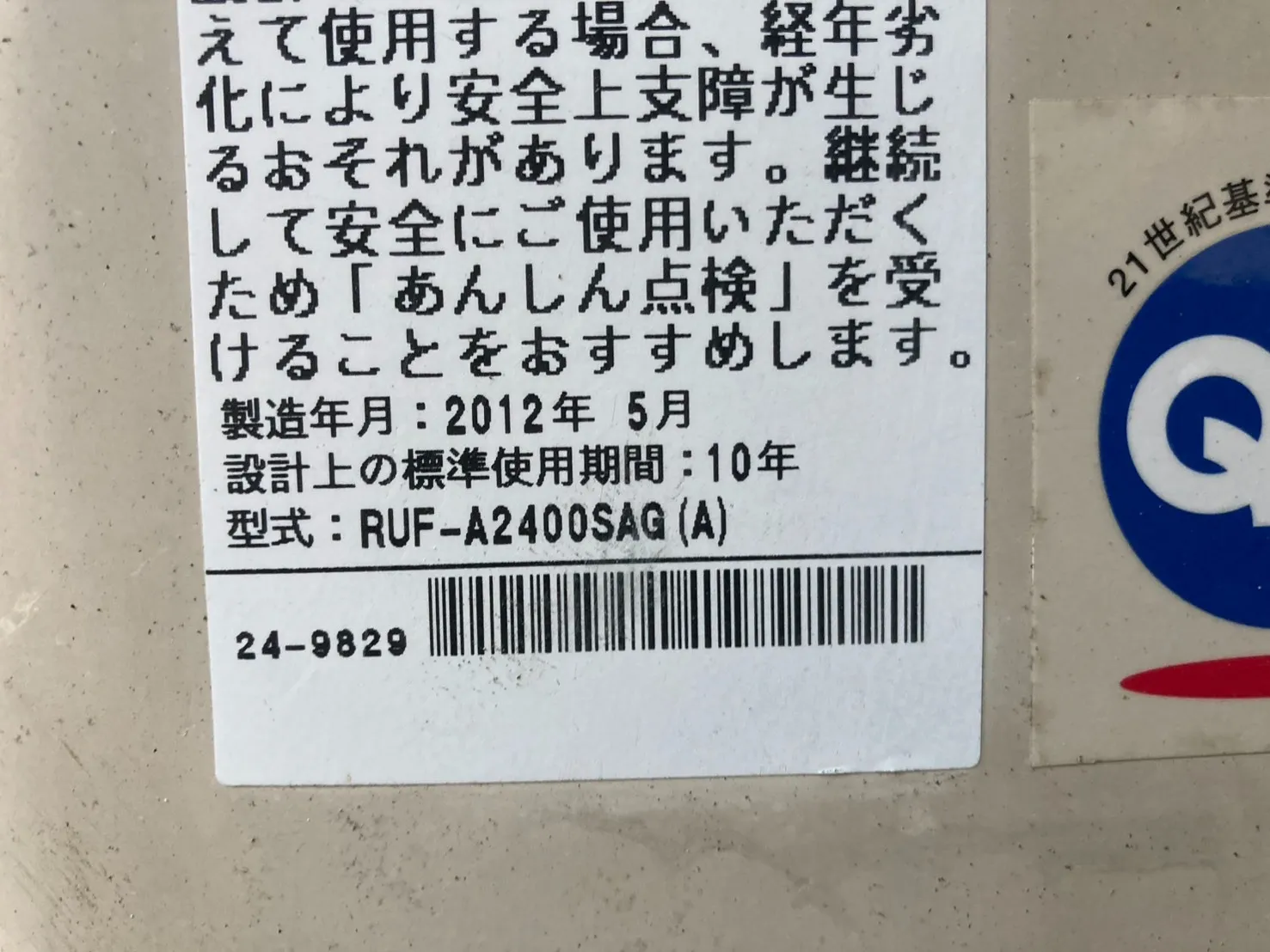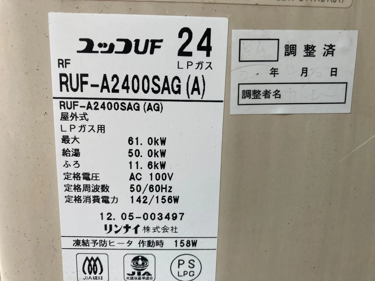 既存の給湯器は、リンナイ、RUF-A2400SAG(A)、24号、オート、屋外据置型、排気カバー付き、給湯器です。