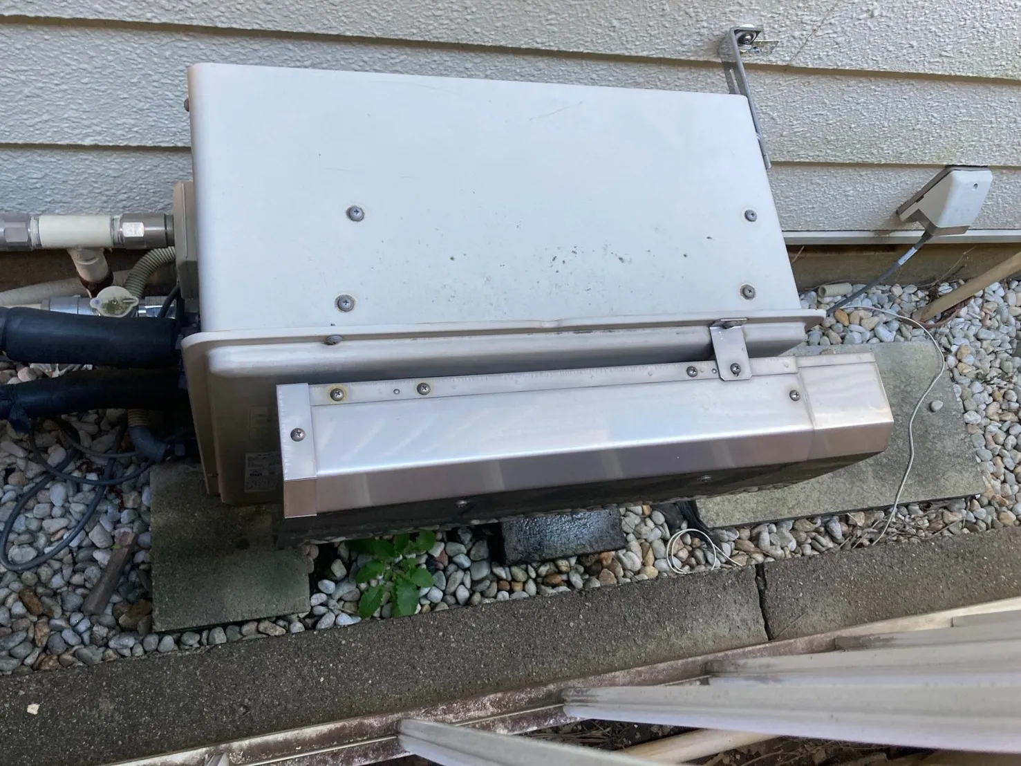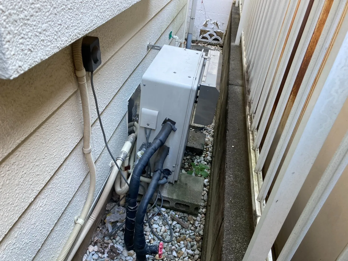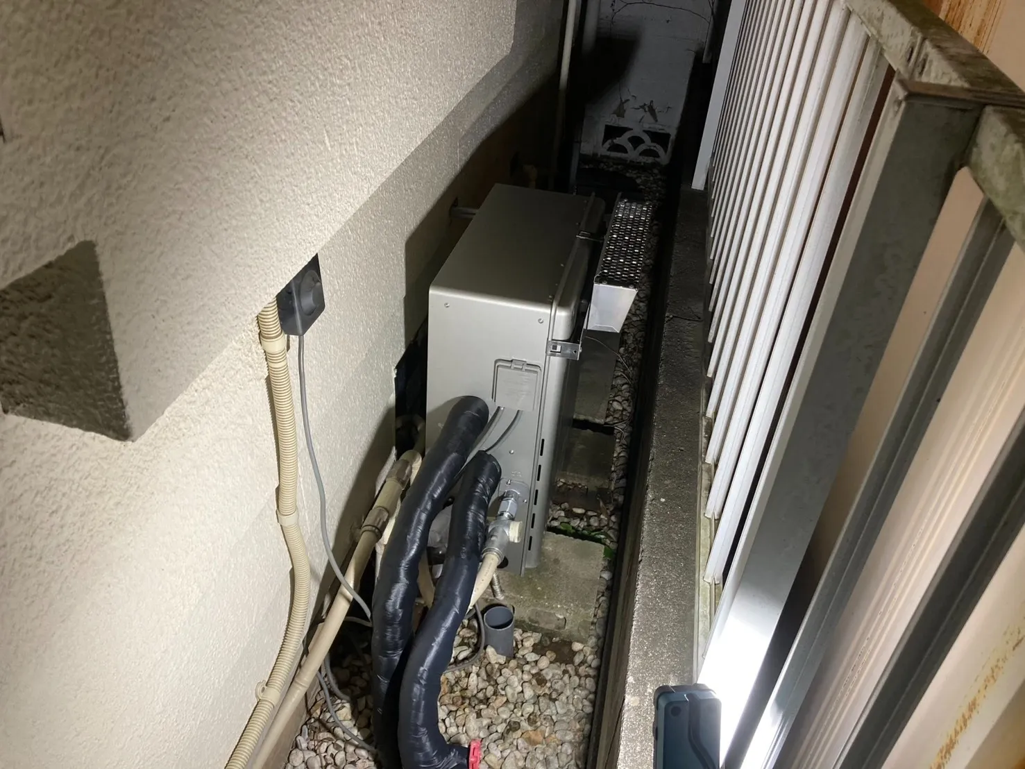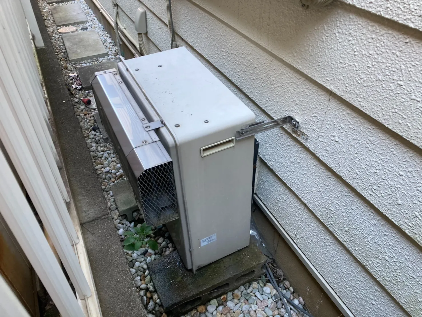 既存の給湯器は、リンナイ、RUF-A2400SAG(A)、24号、オート、屋外据置型、排気カバー付き、給湯器です。
