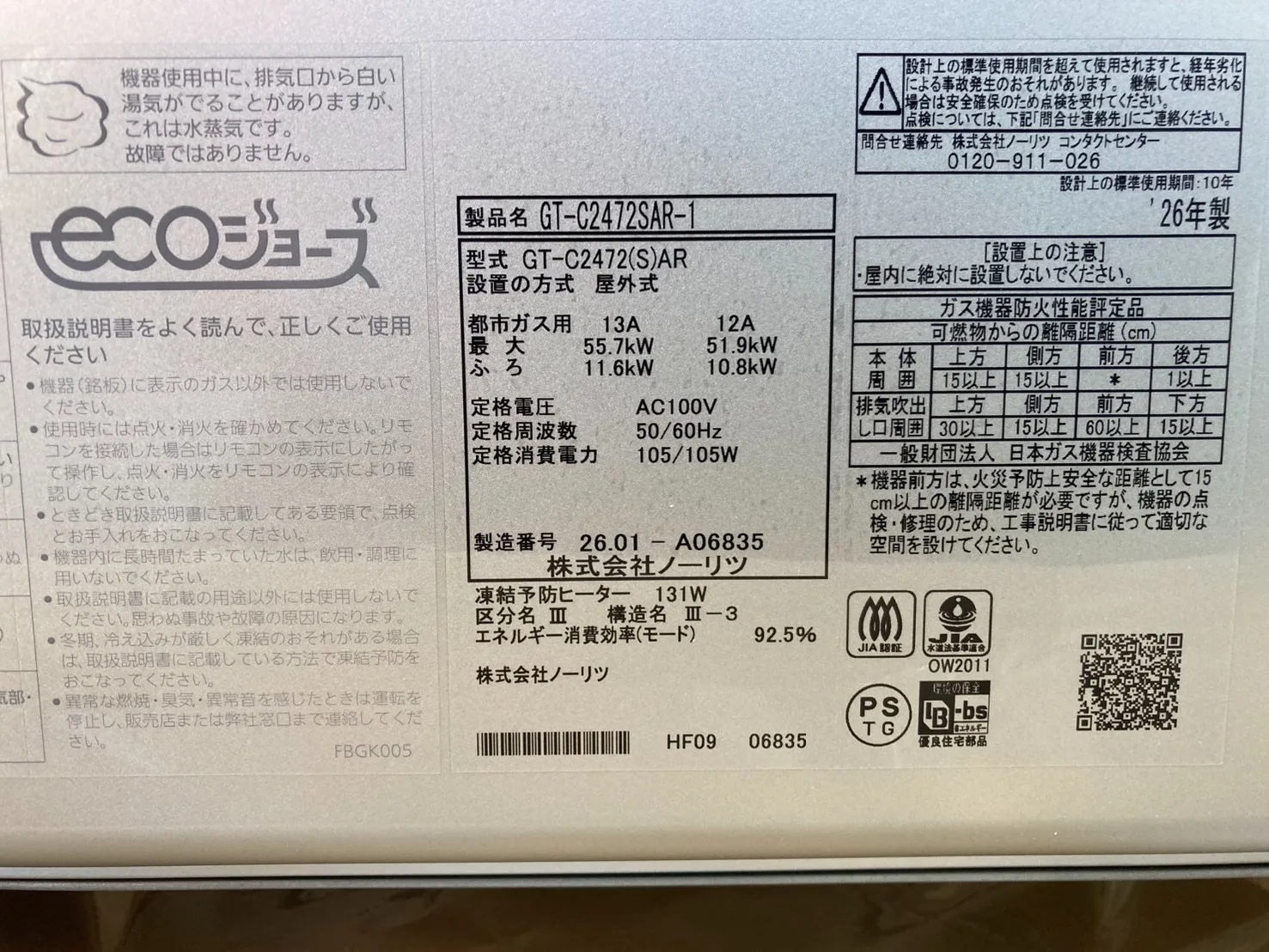 新しい給湯器は、ノーリツ、GT-C2472SAR-1 BL、24号、エコジョーズ、オート、屋外据置型、排気カバー付き、給湯器です。