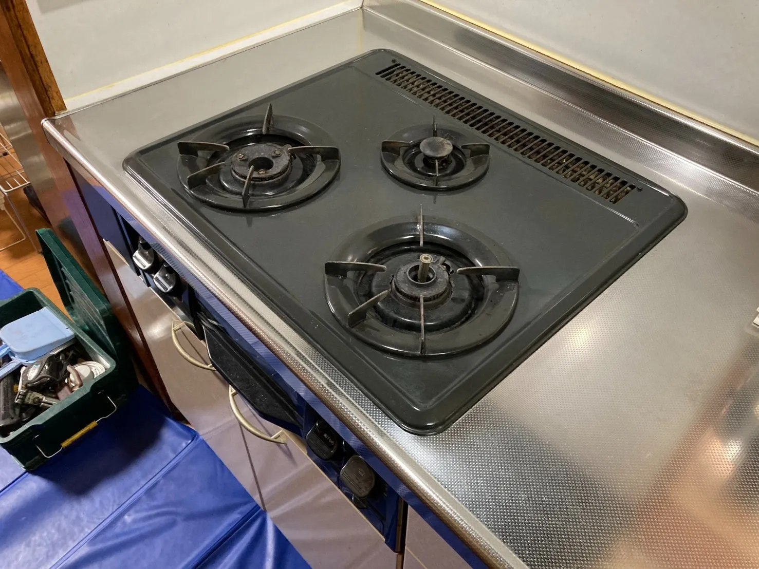 施工前→パロマ、PKD-35EG-L、ホーロートップ、天板幅60cmタイプ、3口、ビルトインコンロ