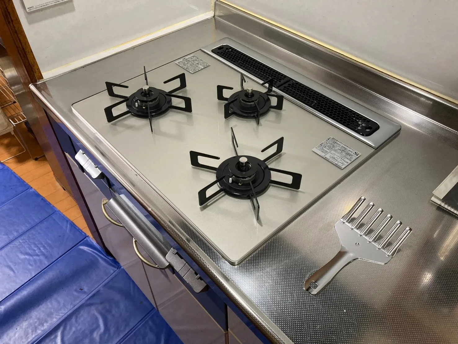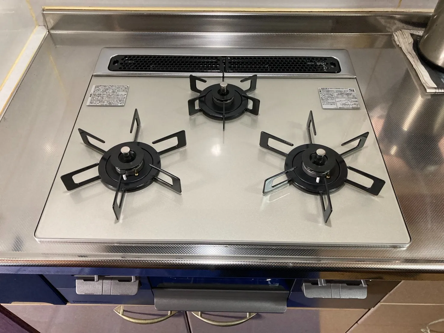 本日は、埼玉県北足立郡伊奈町大針で(1戸建て)、ノーリツ、N3WV6RWTP2SI、ファミ、つやめきガラストップ、天板色ムーンシルバー、フラットエッジ、無水両面焼きグリル、天板幅60mタイプ、3口、ビルトインコンロ交換工事をしました。