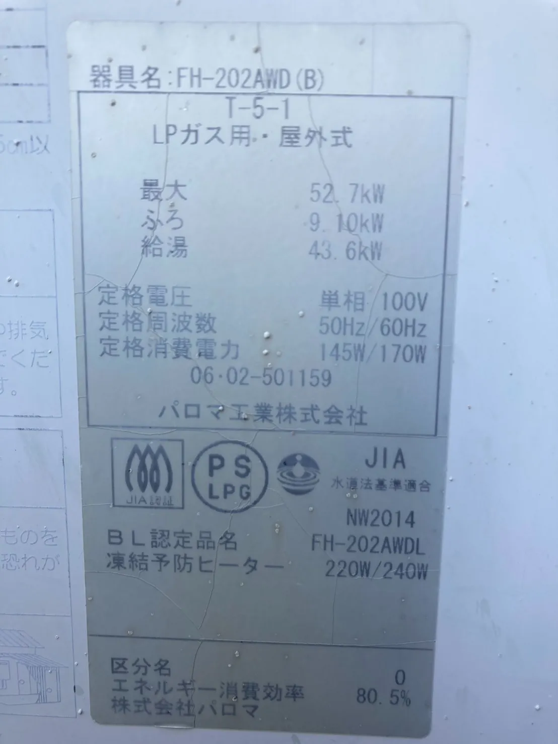 施工前→パロマ、FH-202AWD(B)、20号、オート、屋外壁掛型、給湯器
