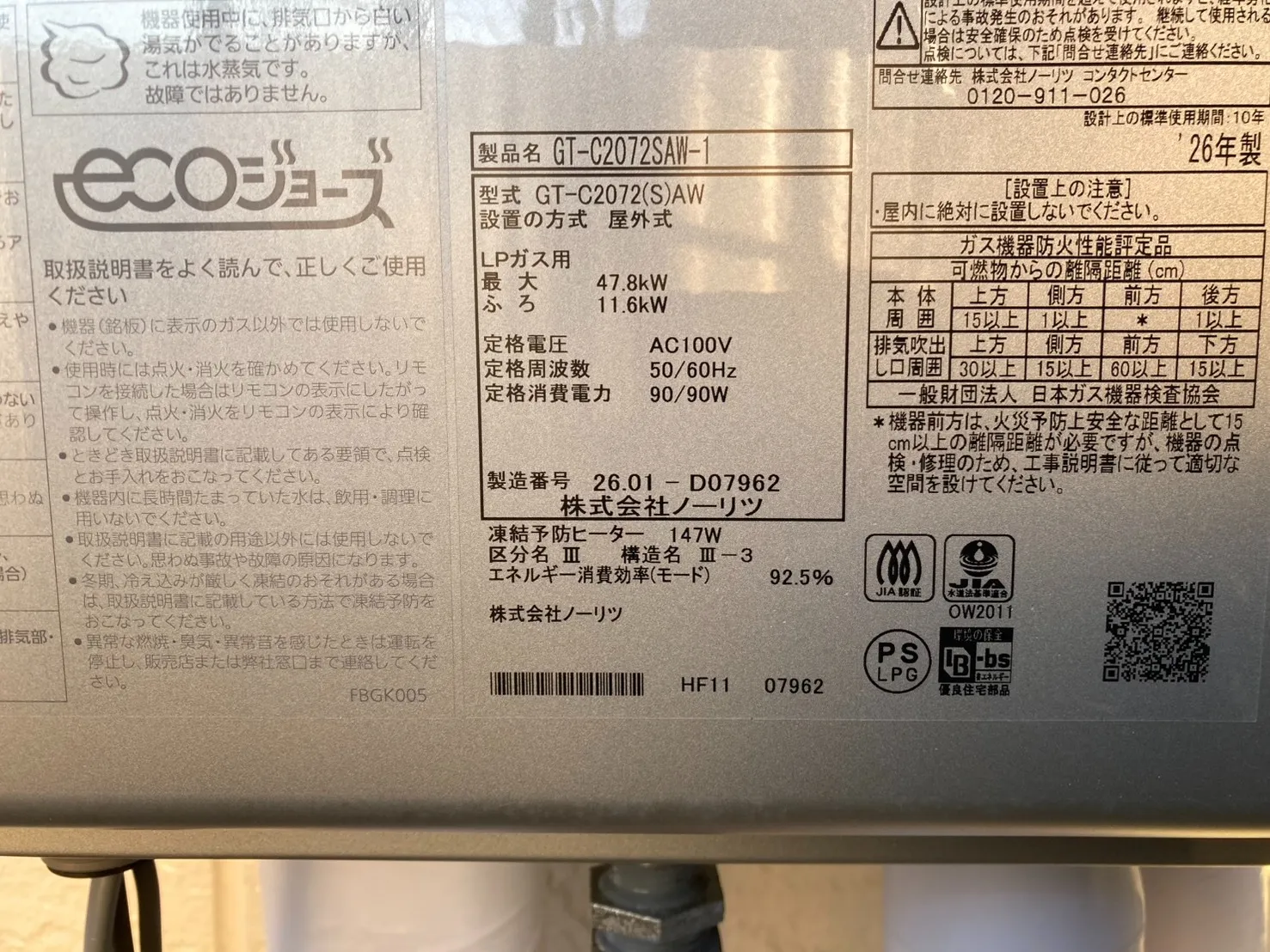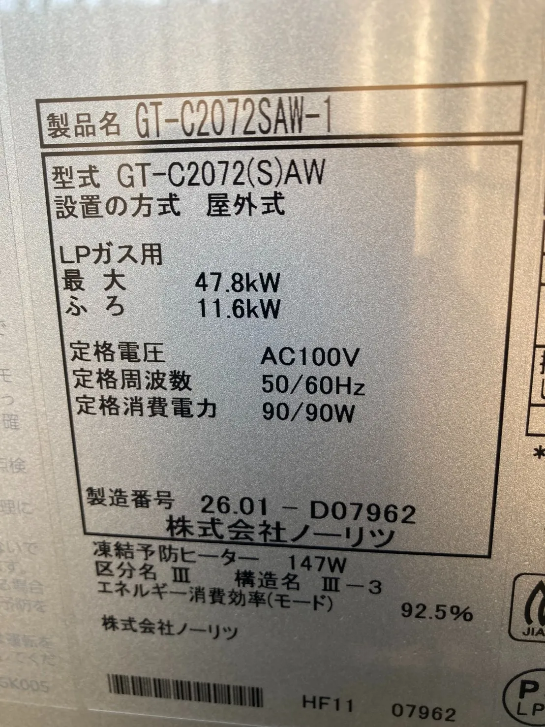 新しい給湯器は、ノーリツ、GT-C2072SAW-1 BL、20号、エコジョーズ、オート、屋外壁掛型です。