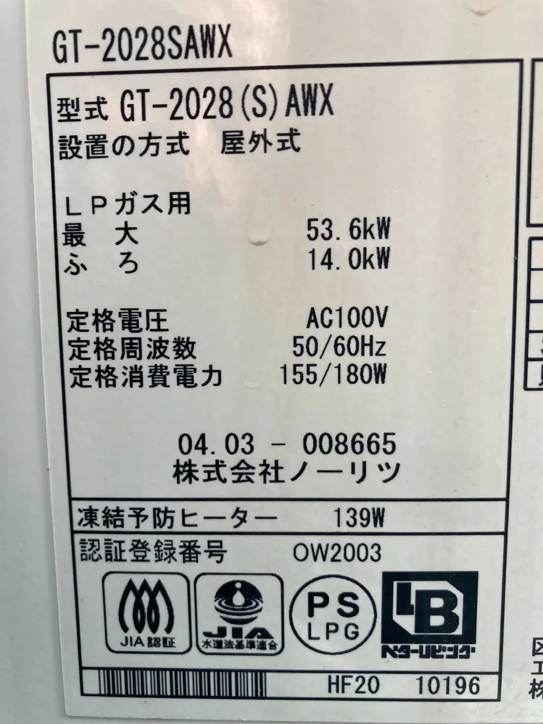 既存の給湯器は、ノーリツ、GT-2028SAWX、20号、オート、屋外壁掛型、ふろ給湯器です。