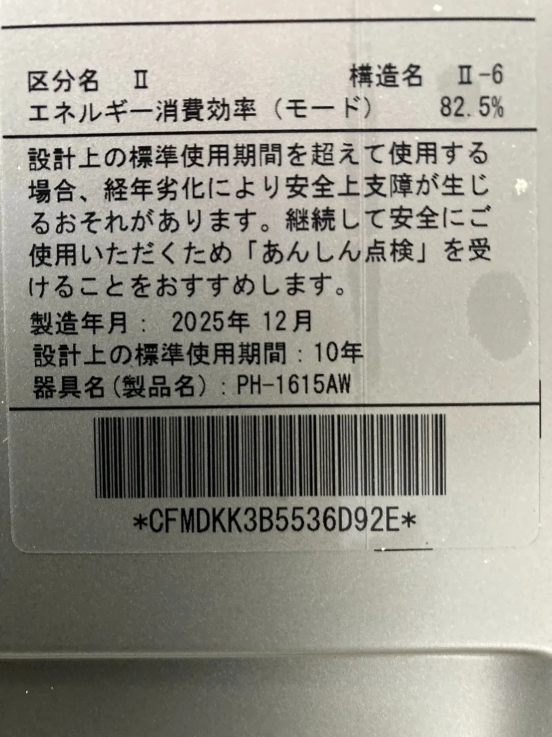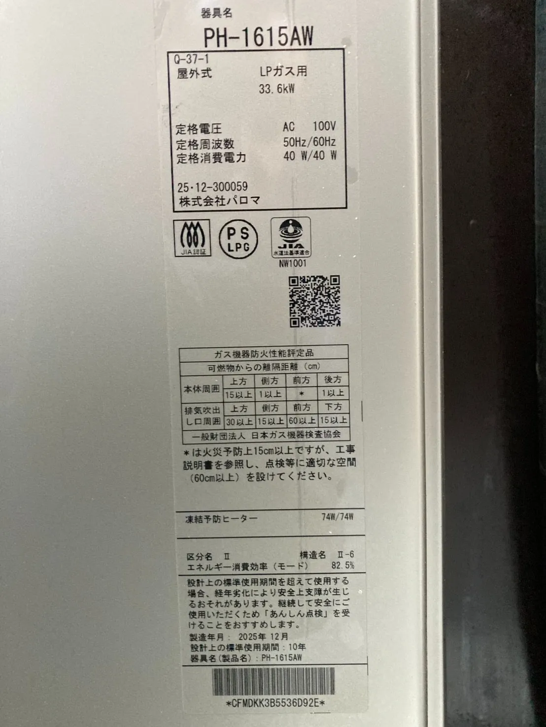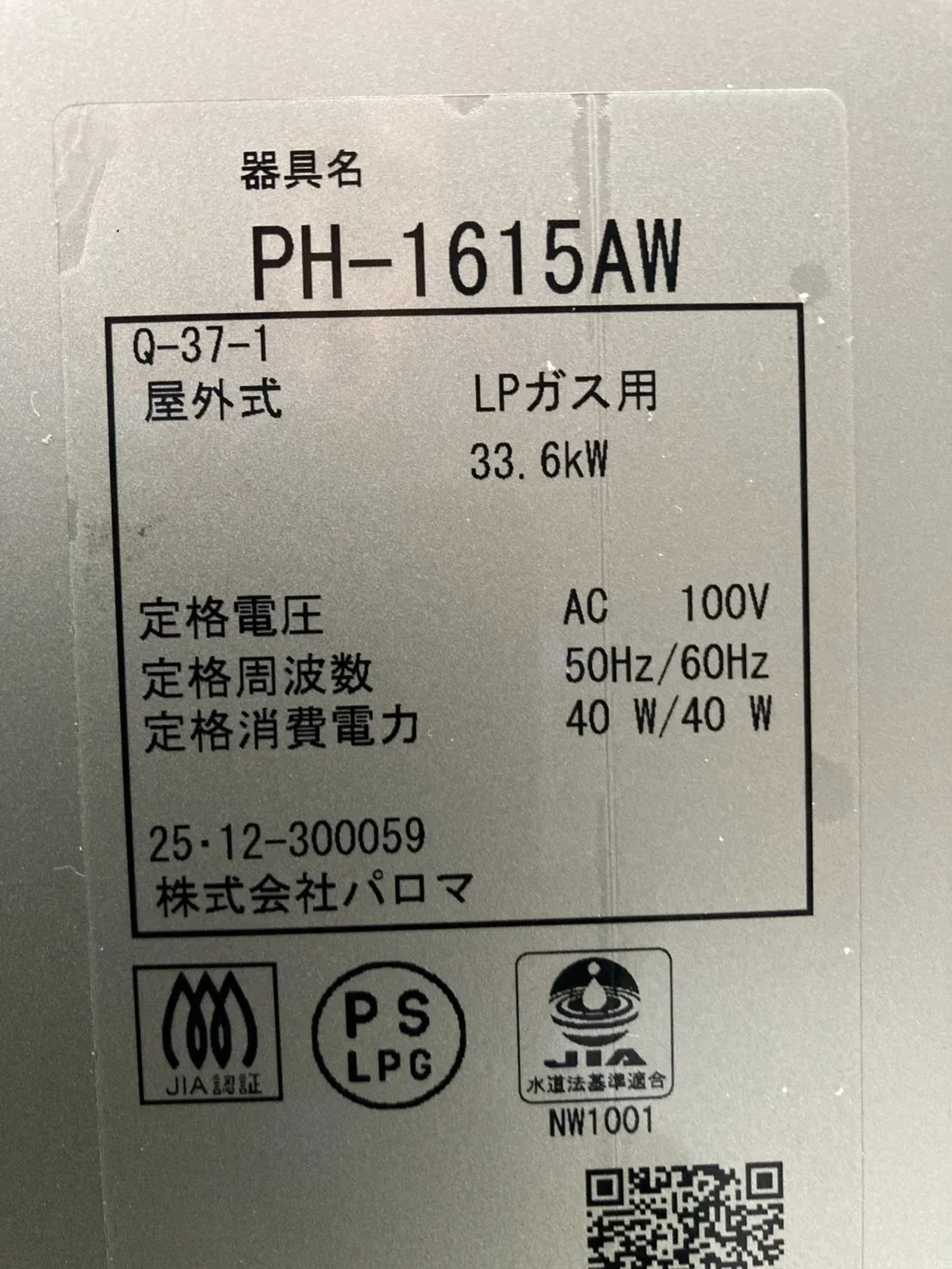 新しい給湯器は、パロマ、PH-1615AW、16号、コンパクトオートストップタイプ、屋外壁掛型、給湯専用、給湯器です。