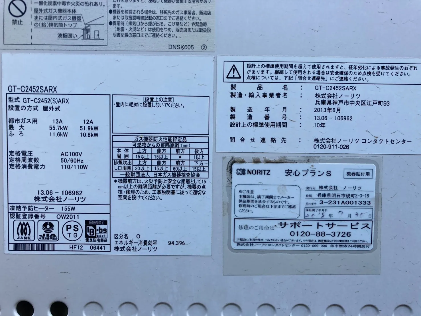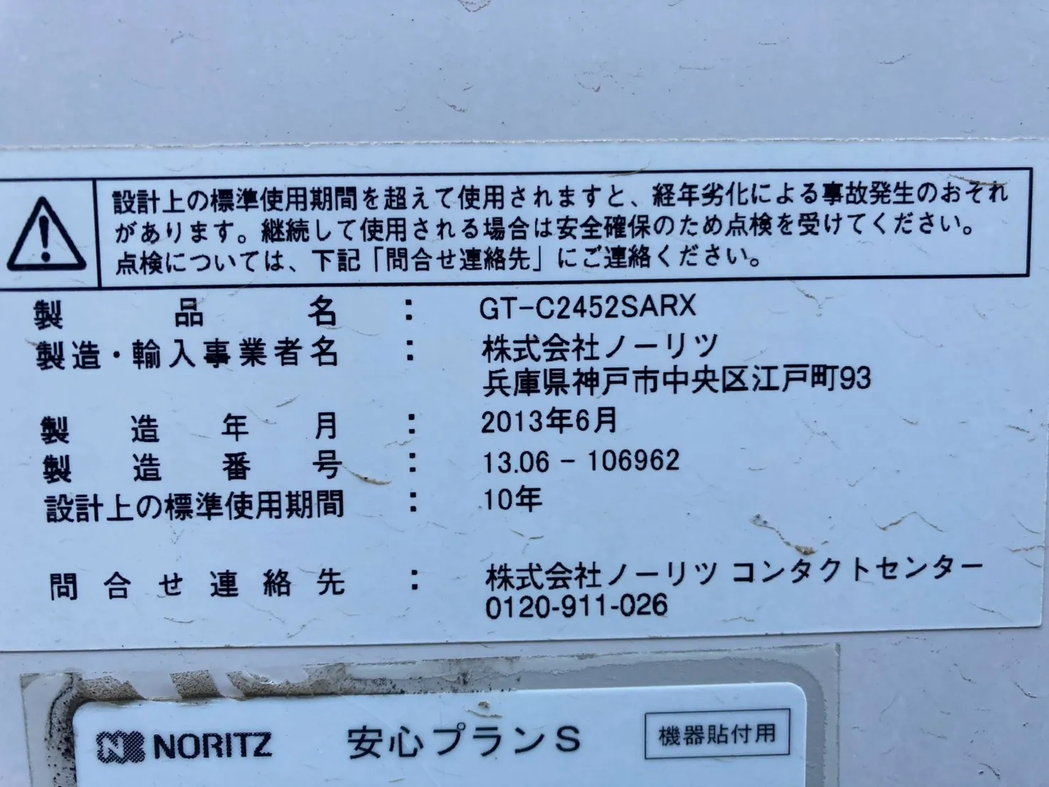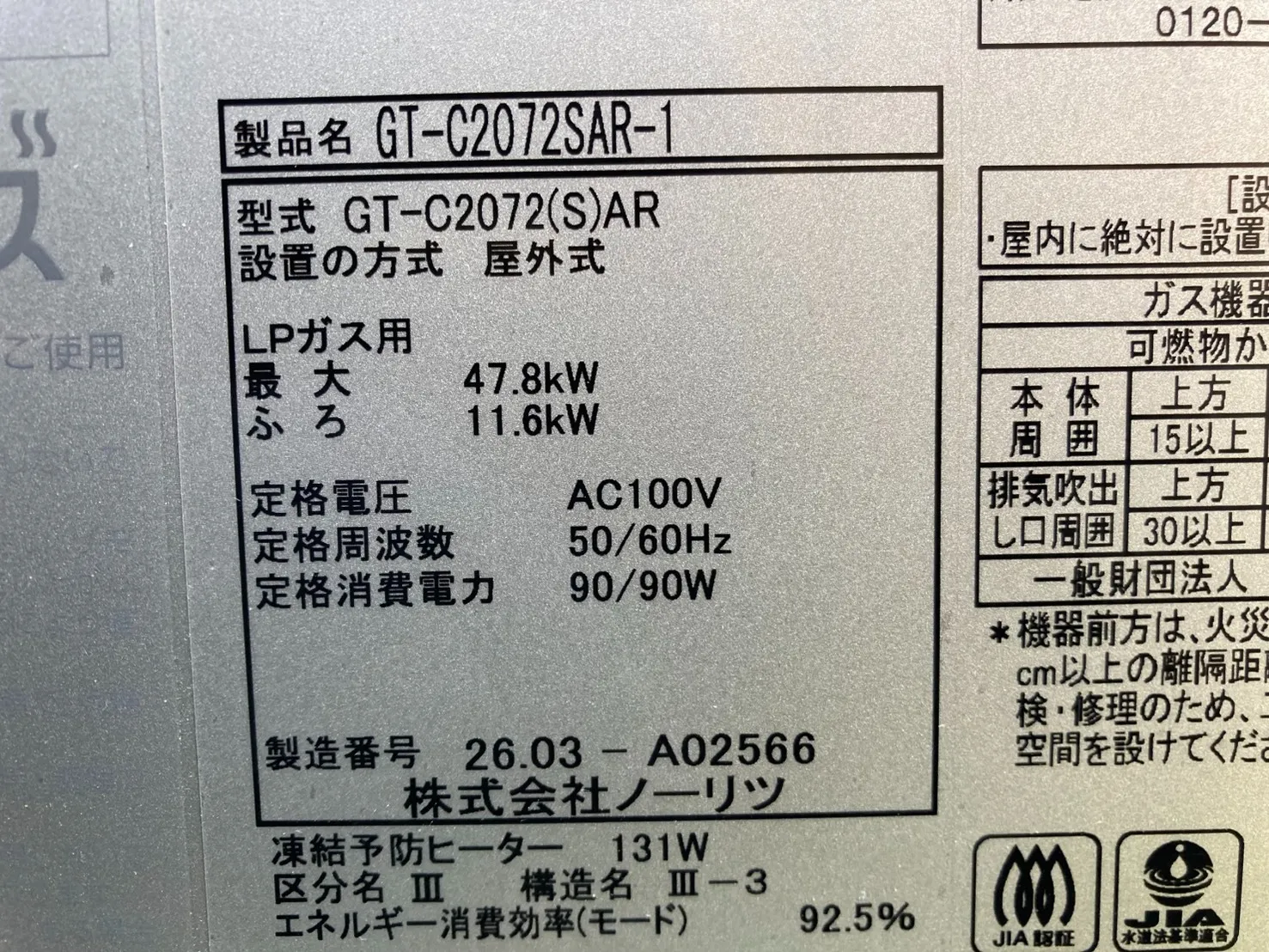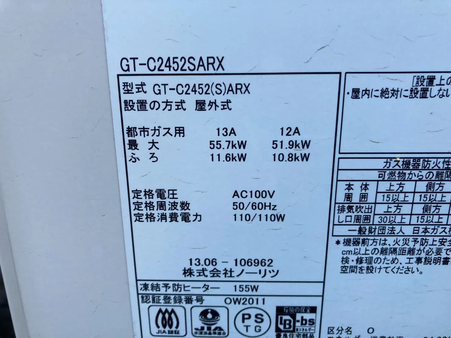 既存の給湯器は、ノーリツ、GT-C2452SARX、24号、エコジョーズ、オート、屋外据置型です。