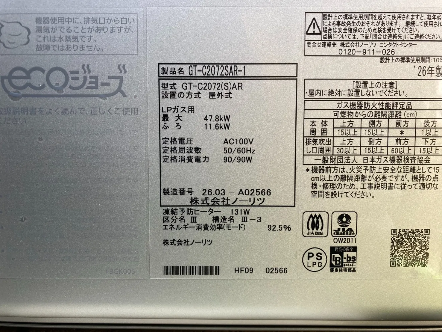 新しい給湯器は、ノーリツ、GT-C2072SAR-1 BL、20号、エコジョーズ、オート、屋外据置型です。
