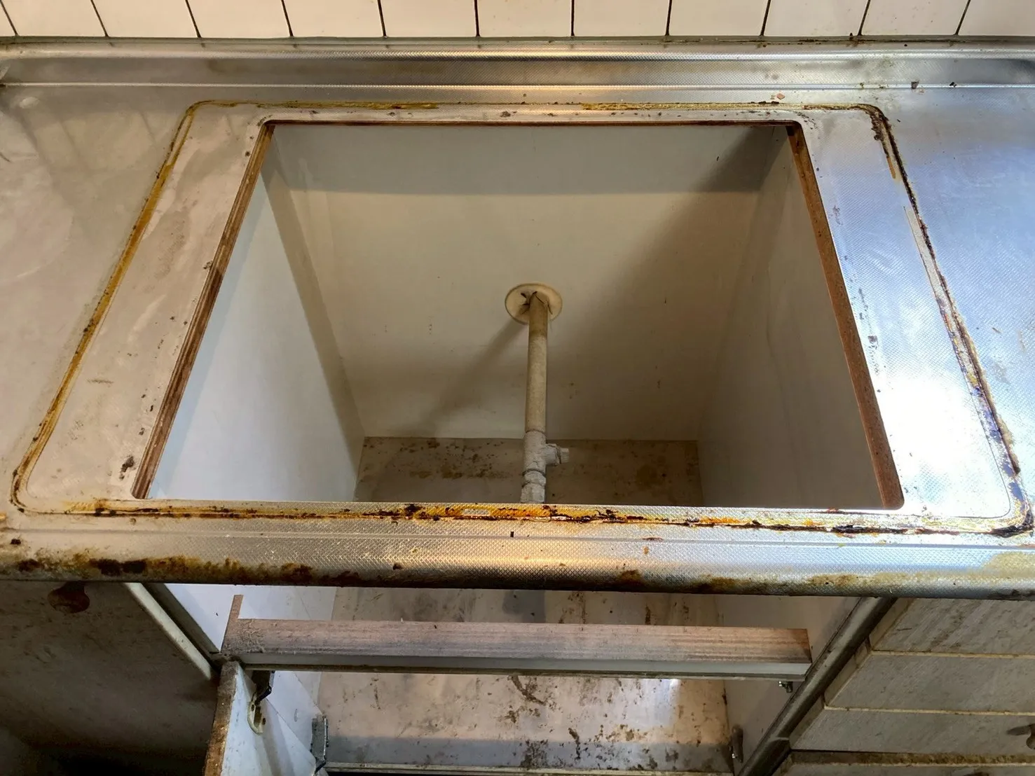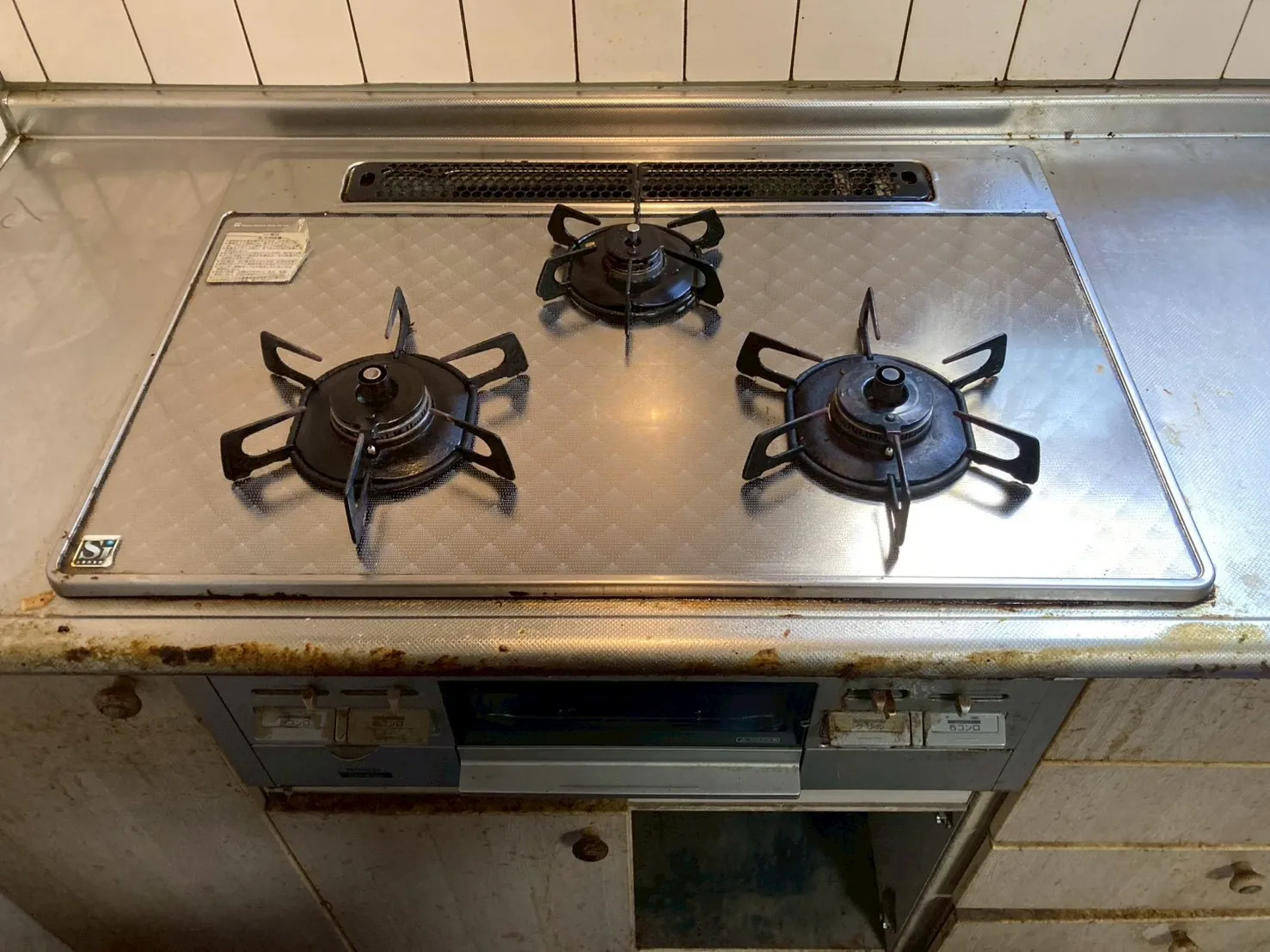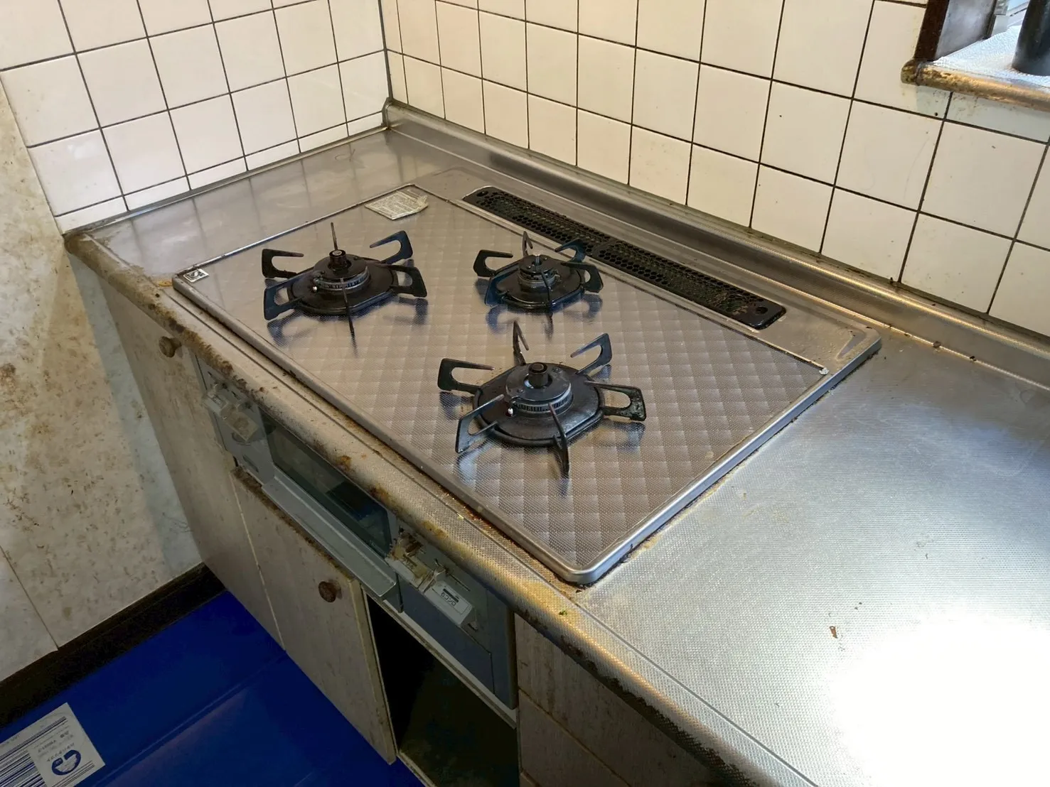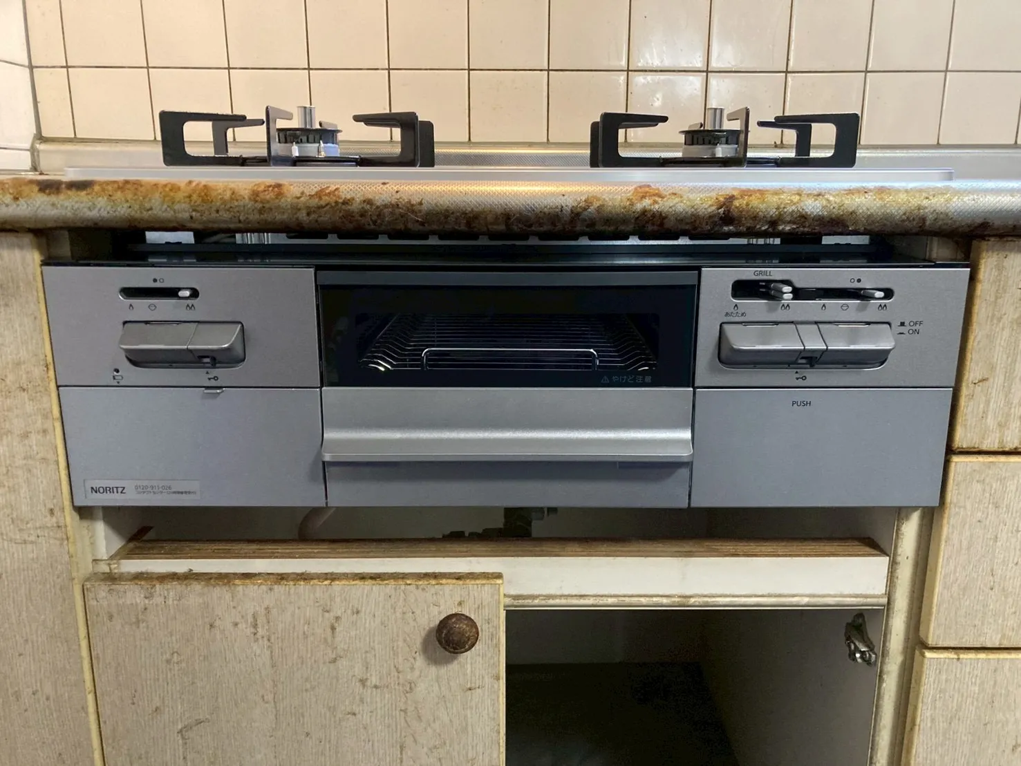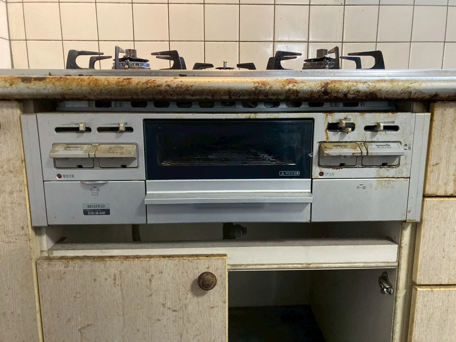 施工前→ハーマン、DW32K4JTR、3口、ガラストップ、天板幅75cmタイプ、ビルトインコンロ