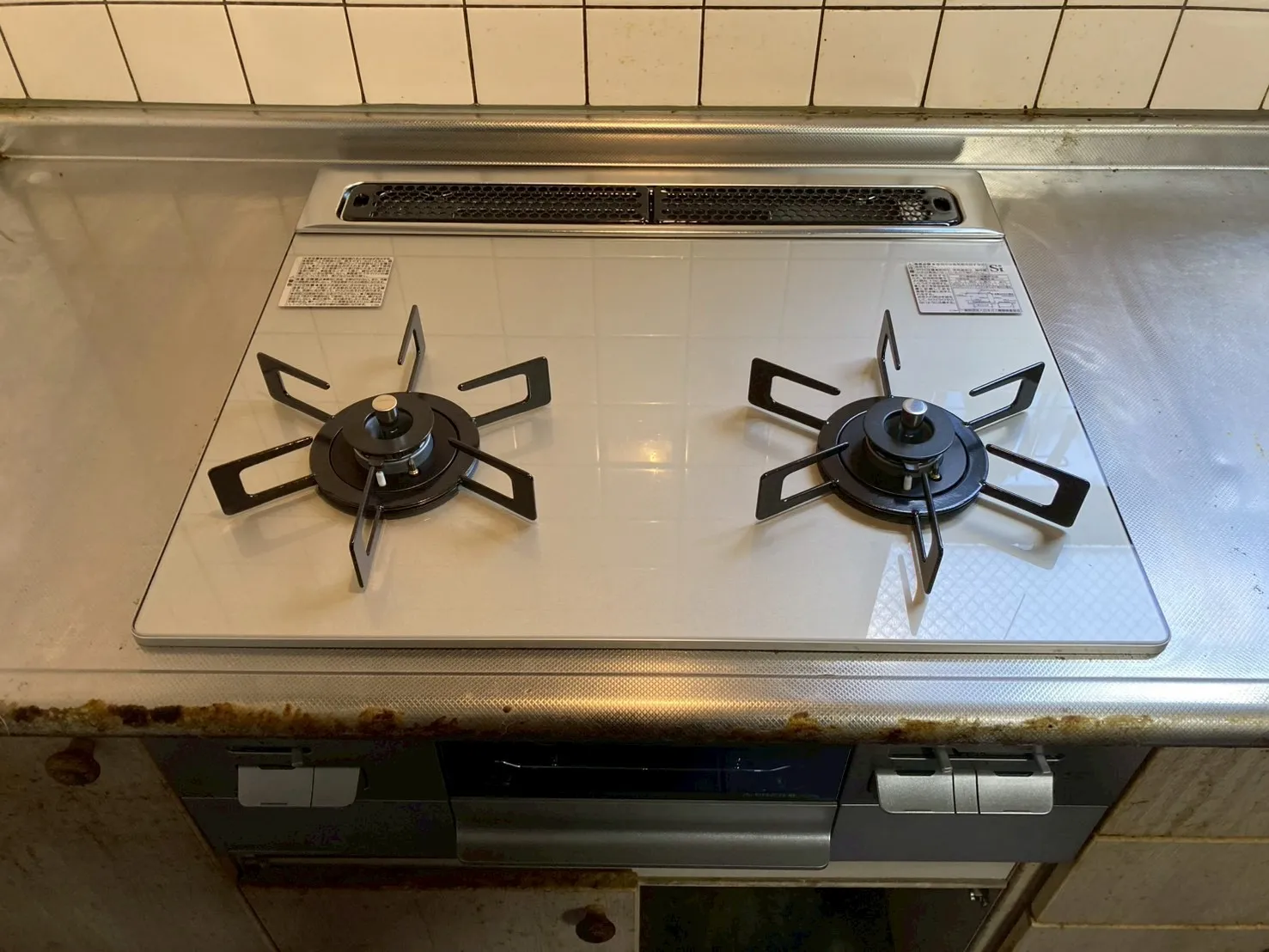 施工後→ノーリツ、N2WV8RWTP2SI、ファミ、2口、つやめきガラストップ、天板色ムーンシルバー、フラットエッジ、無水両面焼きグリル、天板幅60cmタイプ、ビルトインコンロ