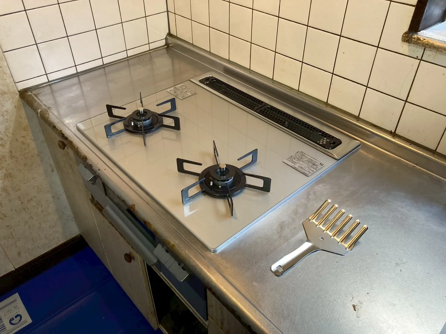 今回は、天板幅75cmタイプから天板幅60cmタイプ、3口から2口へのビルトインコンロ交換工事でした。