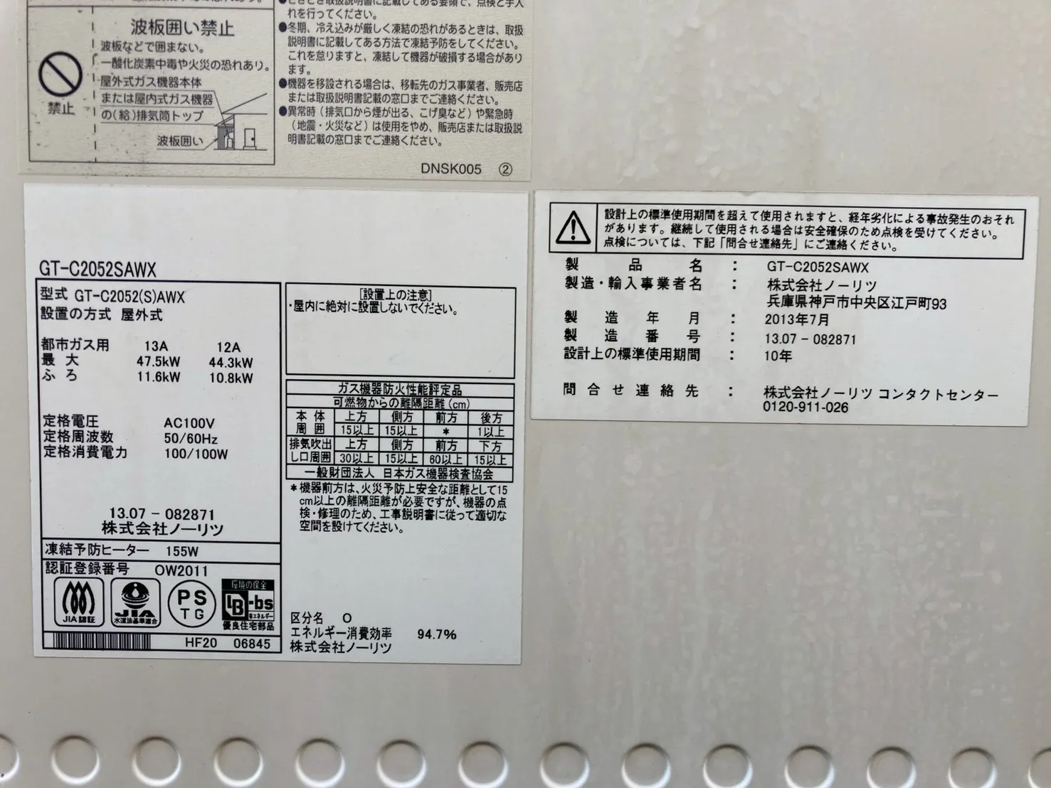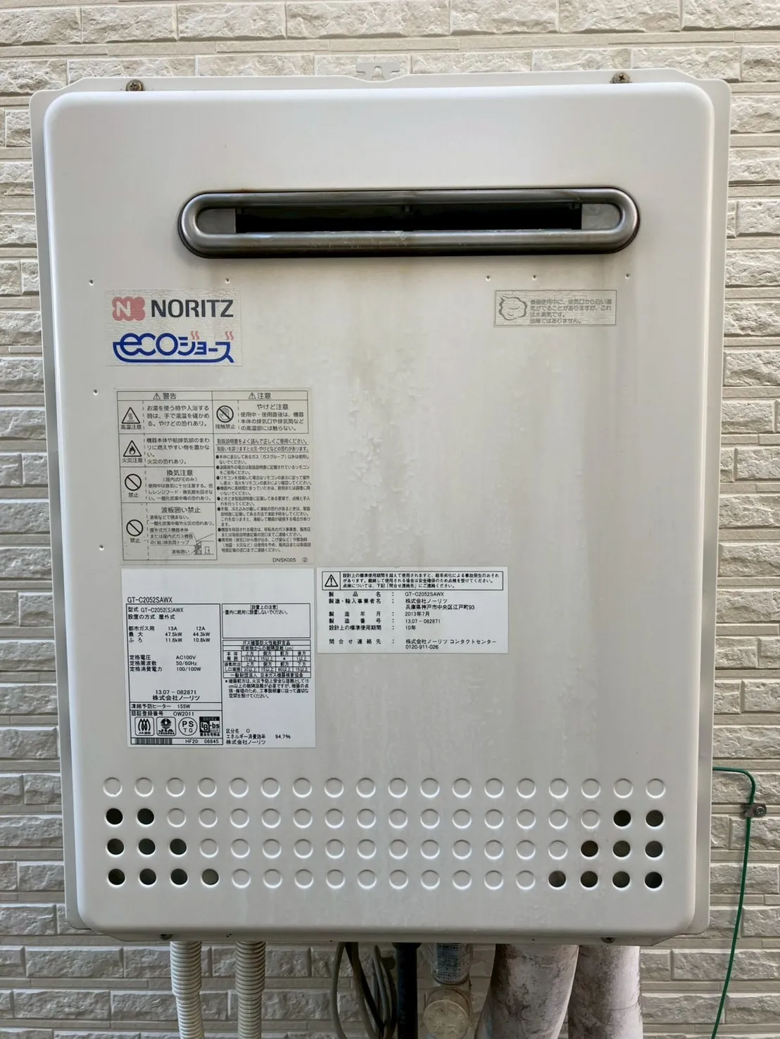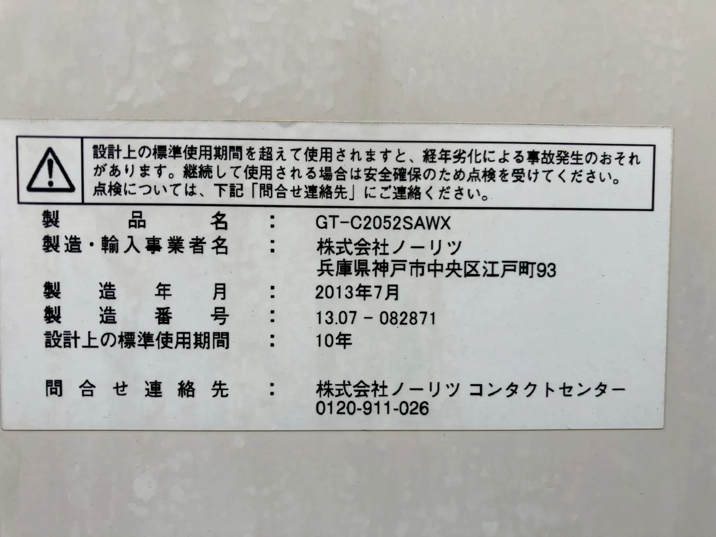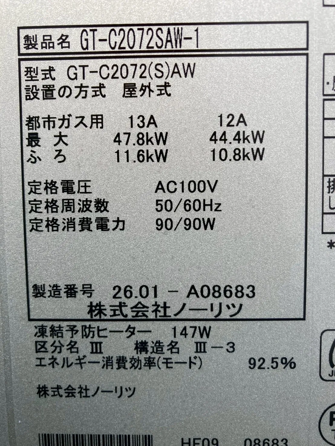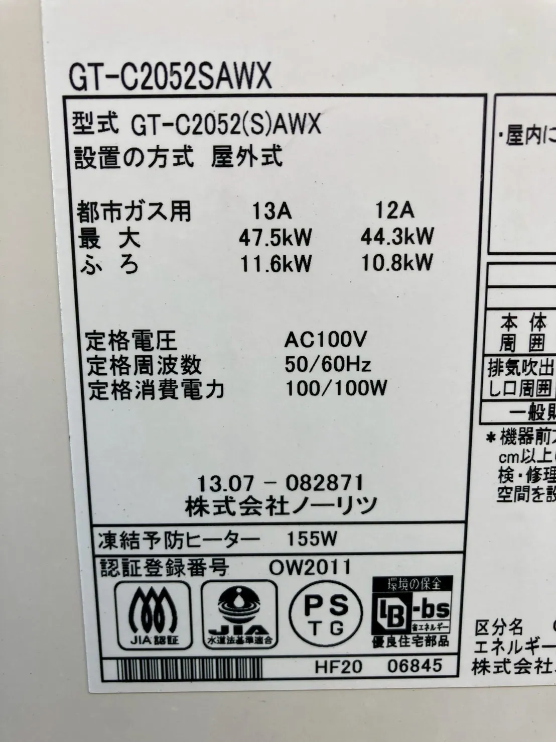 既存の給湯器は、ノーリツ、GT-C2052SAWX BL、20号、エコジョーズ、オート、屋外壁掛型です。
