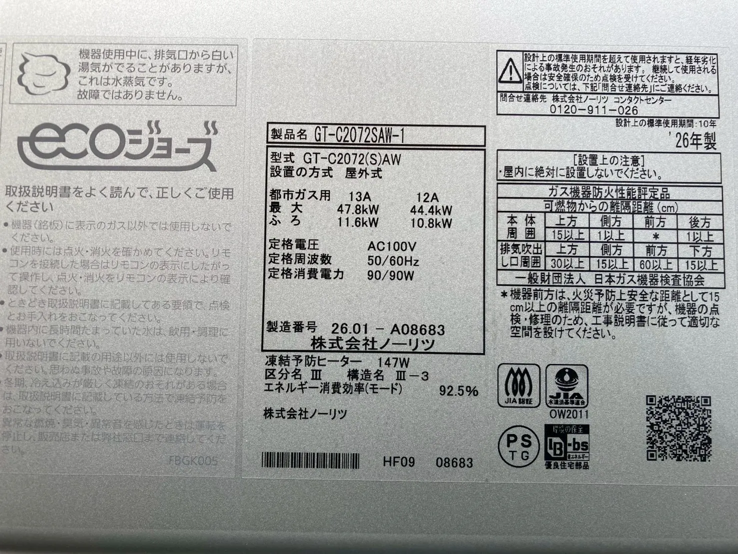 新しい給湯器は、ノーリツ、GT-C2072SAW-1 BL、20号、エコジョーズ、オート、屋外壁掛型です。